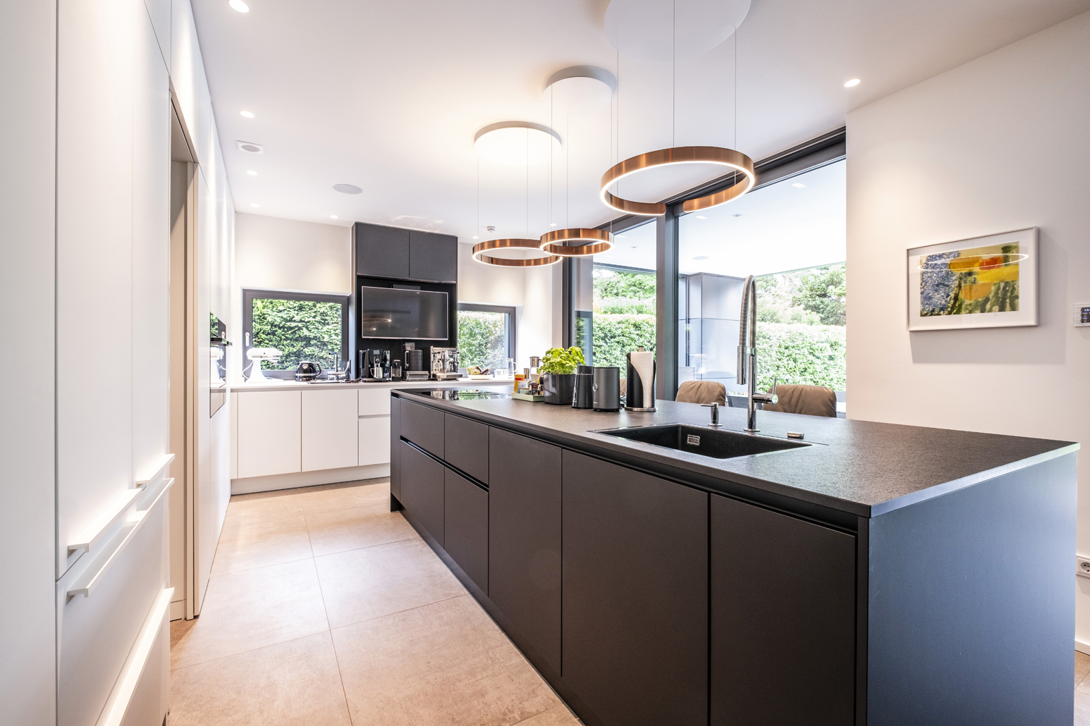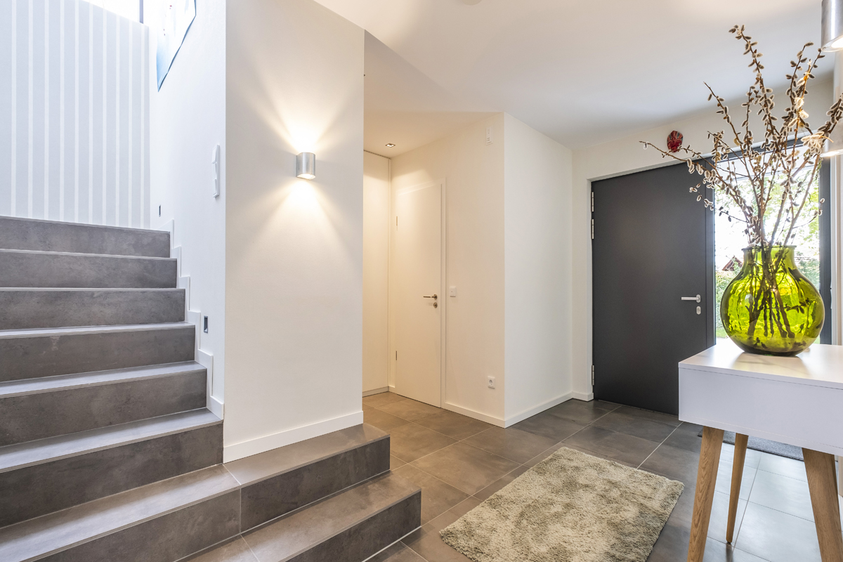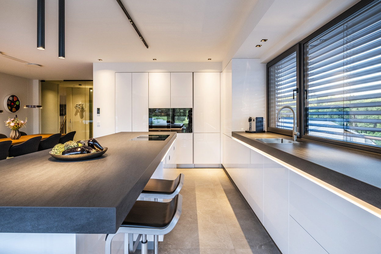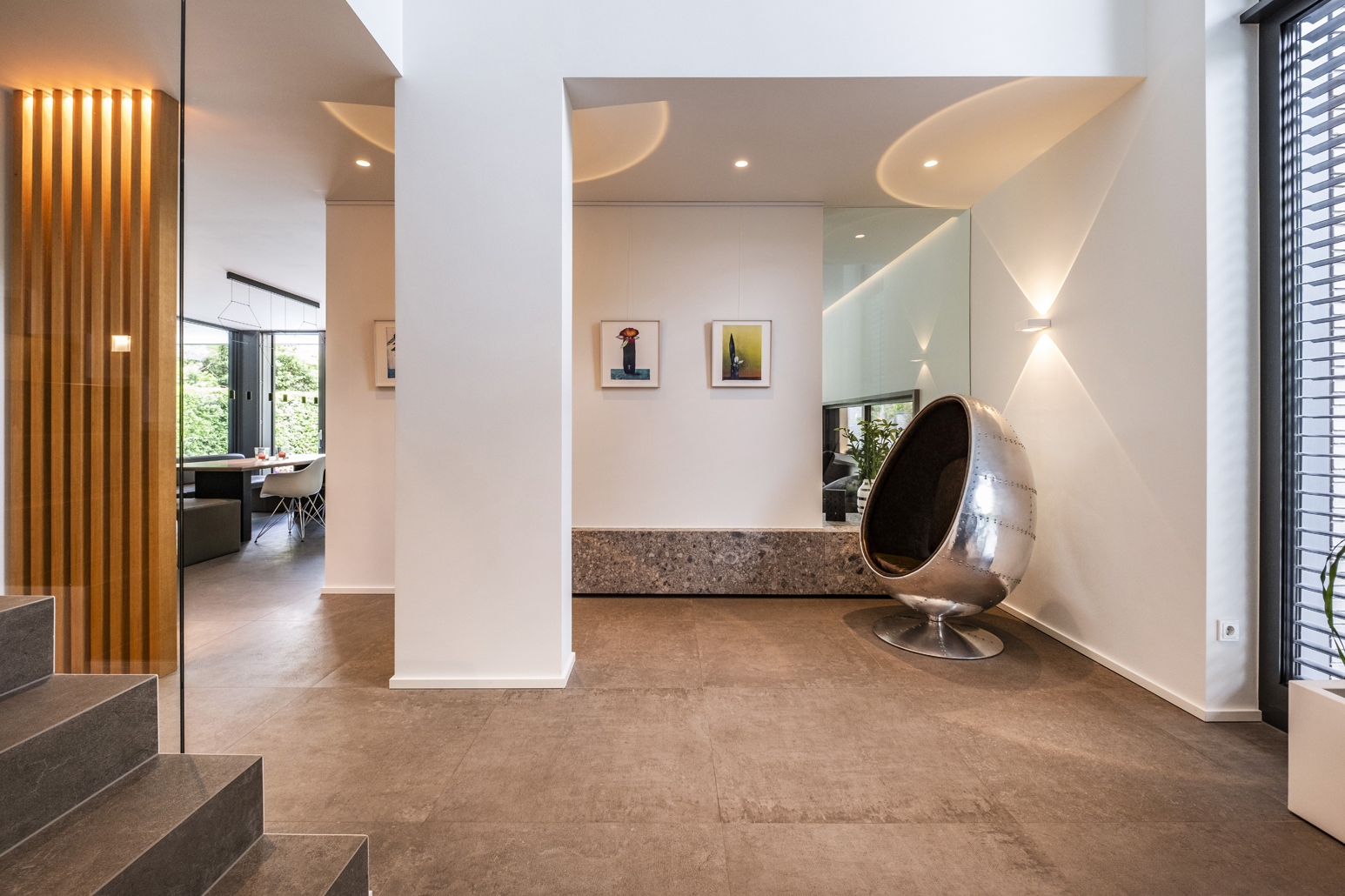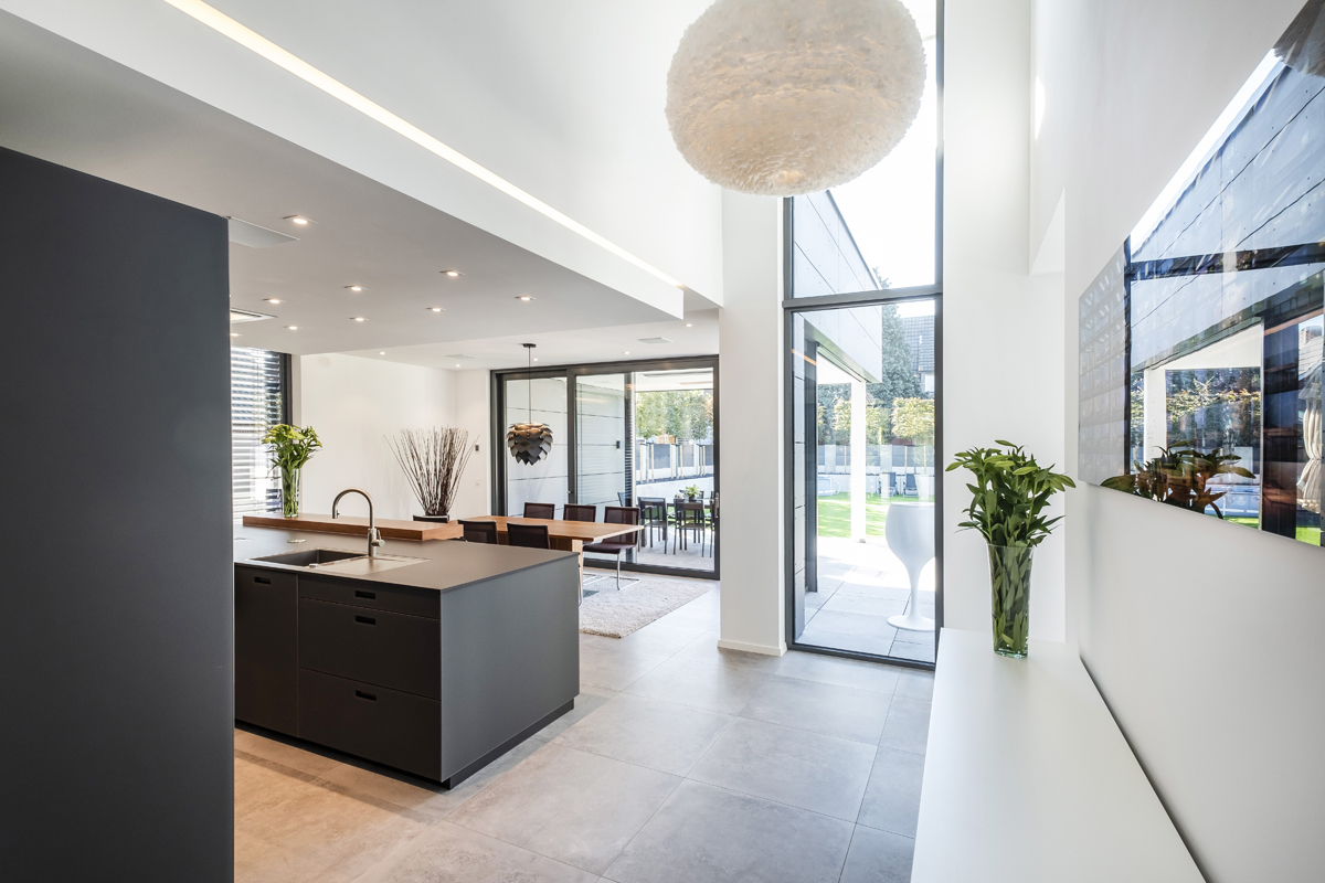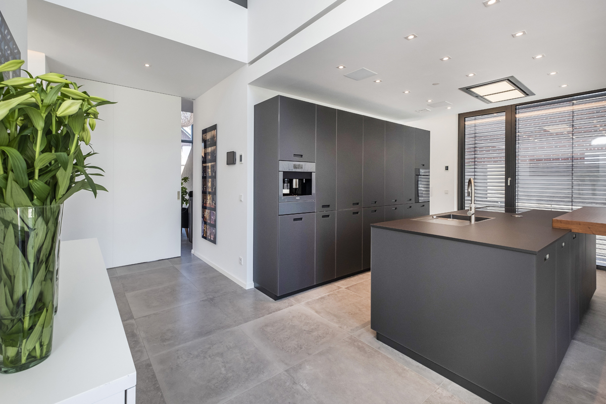 Ein konsequent verfolgtes Farb- und Formkonzept erzeugt hier die schlichte Eleganz, die sich das Bauherren-Ehepaar erwünscht hat. Die Farben Weiß, Schwarz und Anthrazit stehen hier im Vordergrund. Das frische Grün der Pflanzen und der warme Sandton der Kieselsteine geben dem Gesamtprojekt Natürlichkeit und Wärme.