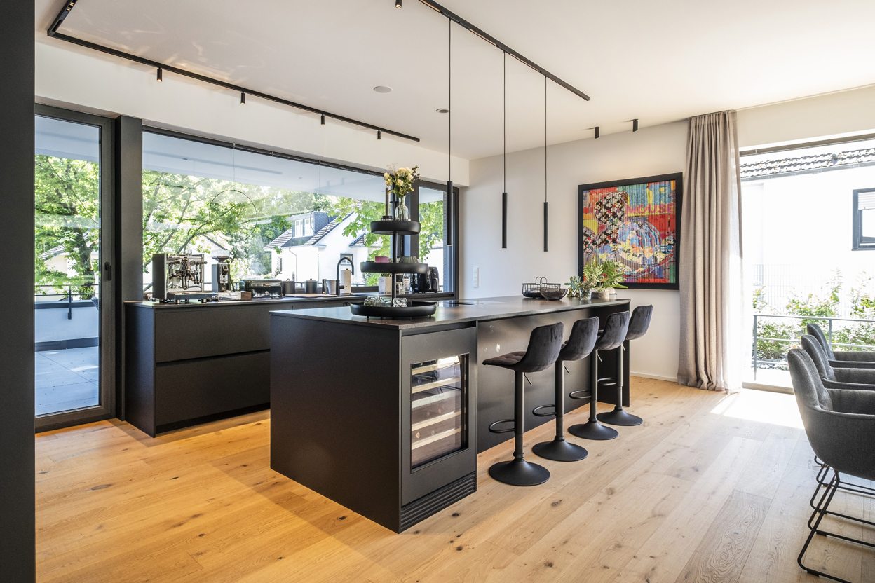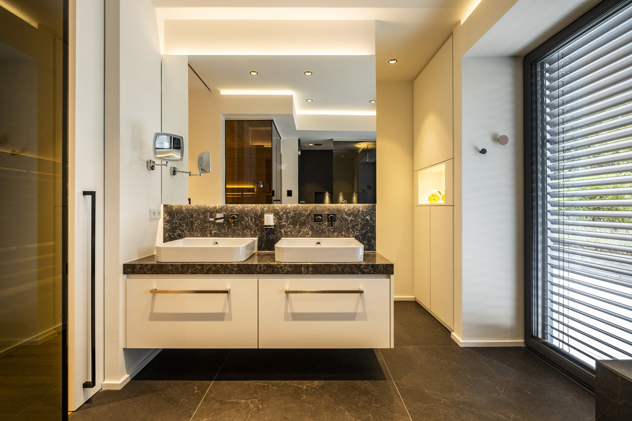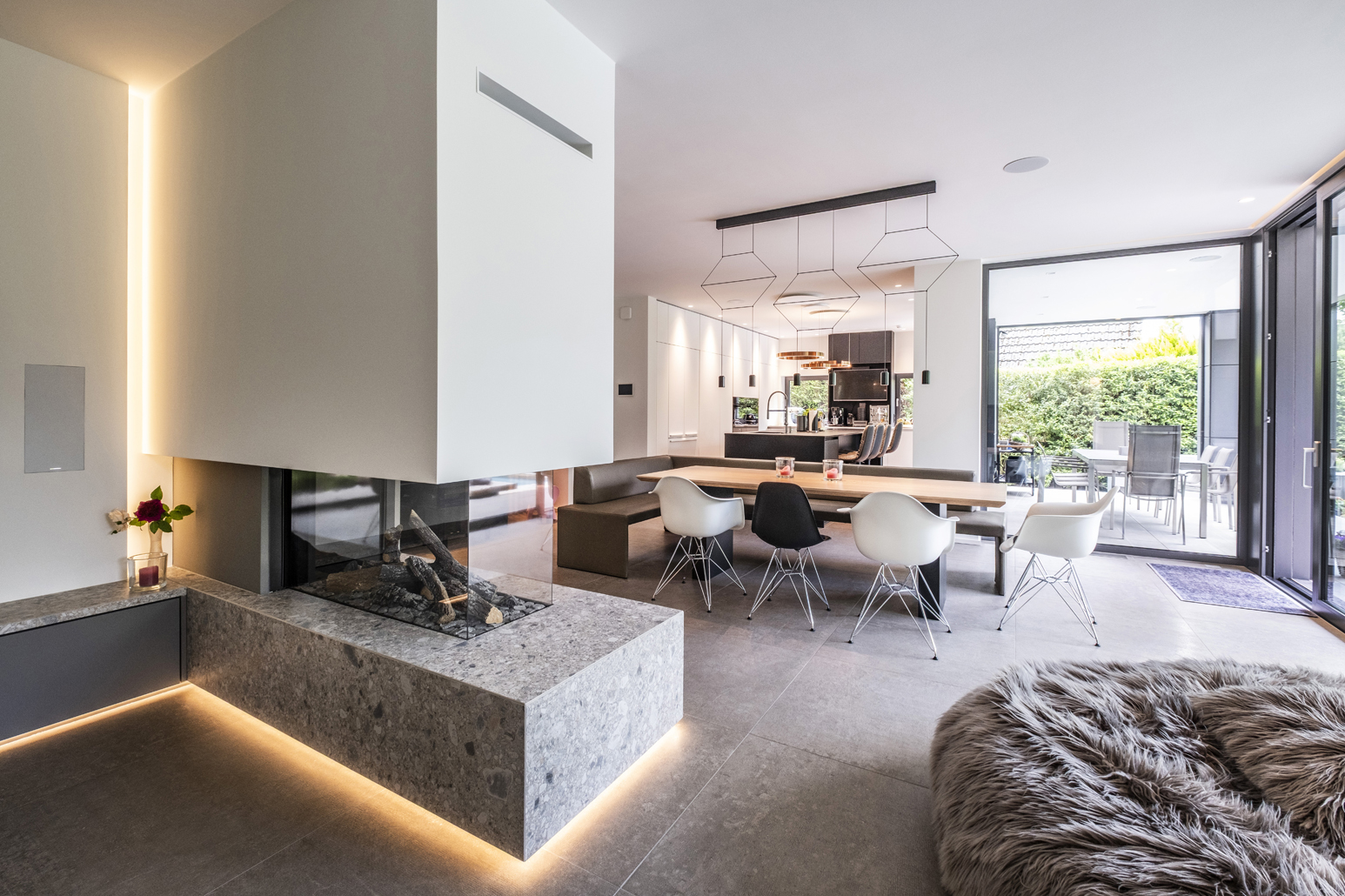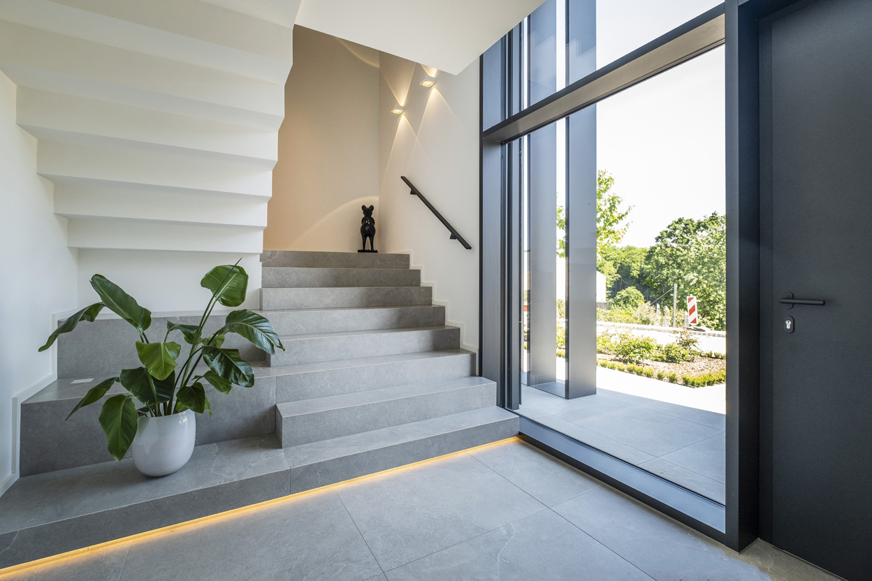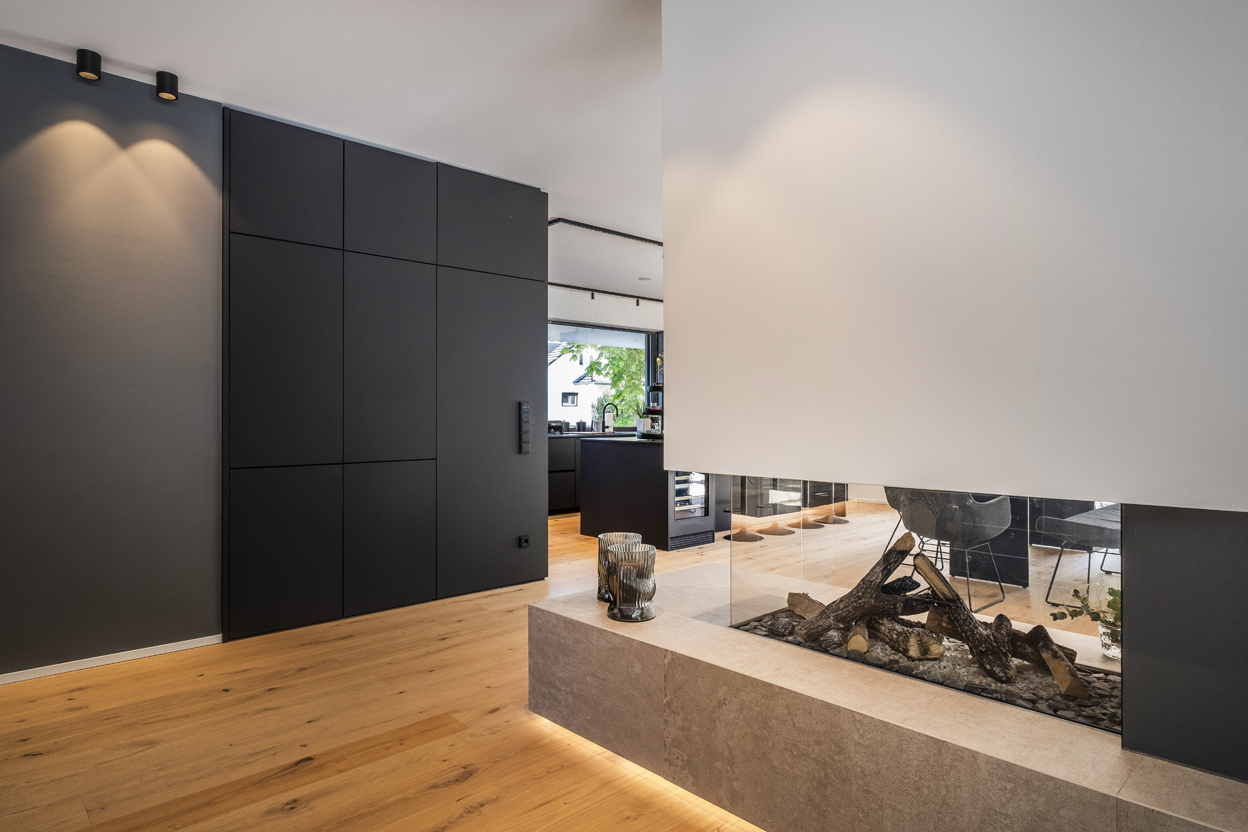 Ein konsequent verfolgtes Farb- und Formkonzept erzeugt hier die schlichte Eleganz, die sich das Bauherren-Ehepaar erwünscht hat. Die Farben Weiß, Schwarz und Anthrazit stehen hier im Vordergrund. Das frische Grün der Pflanzen und der warme Sandton der Kieselsteine geben dem Gesamtprojekt Natürlichkeit und Wärme.