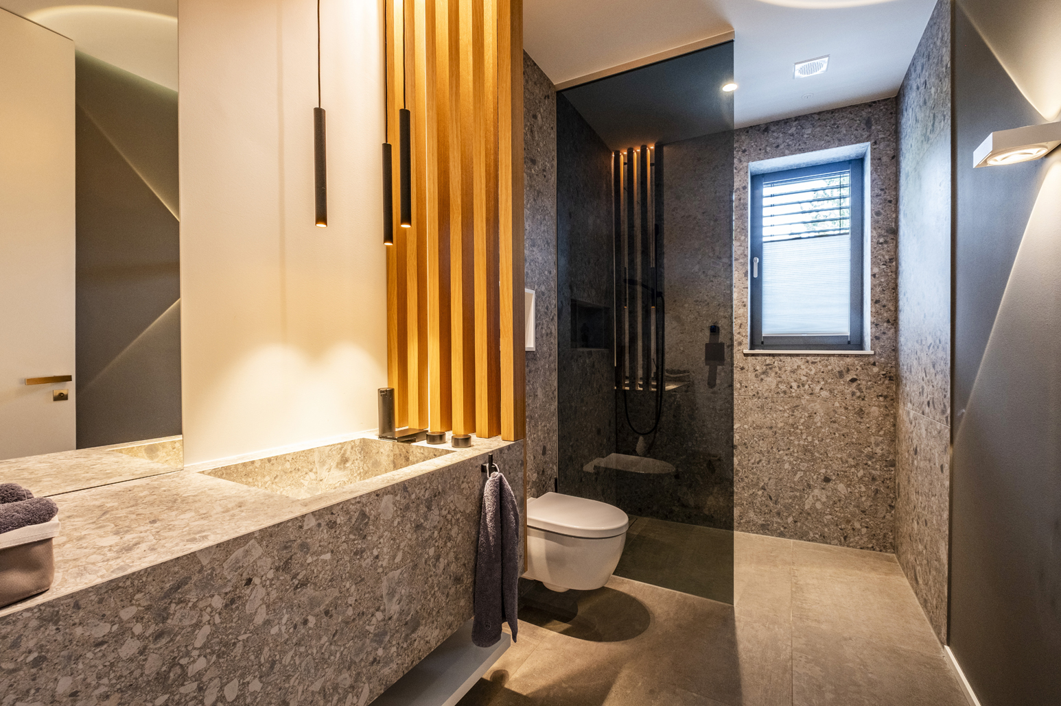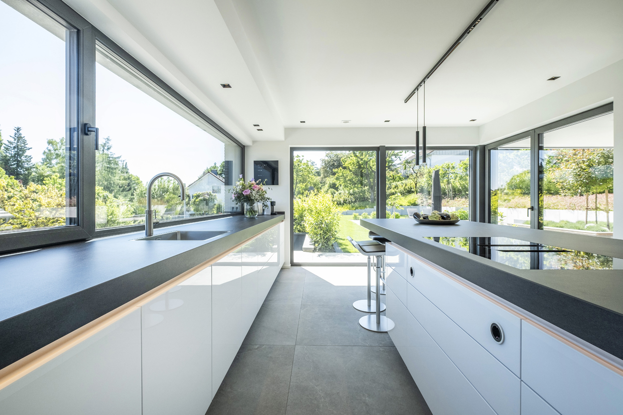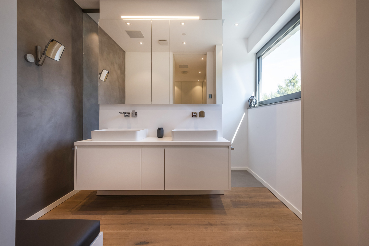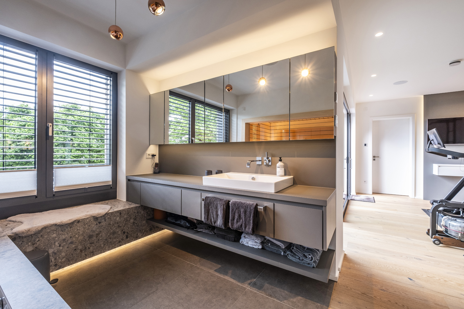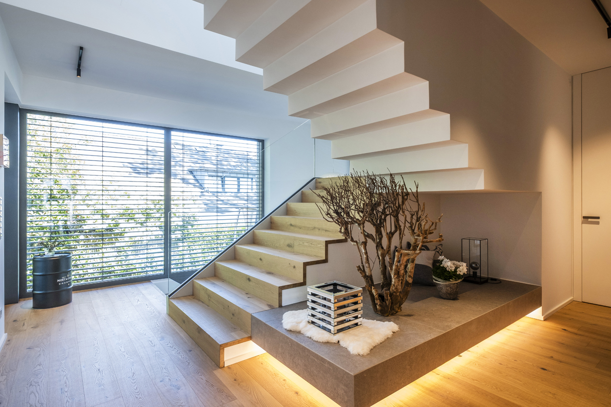 Ein konsequent verfolgtes Farb- und Formkonzept erzeugt hier die schlichte Eleganz, die sich das Bauherren-Ehepaar erwünscht hat. Die Farben Weiß, Schwarz und Anthrazit stehen hier im Vordergrund. Das frische Grün der Pflanzen und der warme Sandton der Kieselsteine geben dem Gesamtprojekt Natürlichkeit und Wärme.