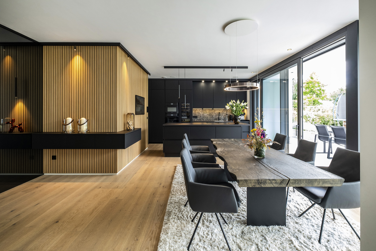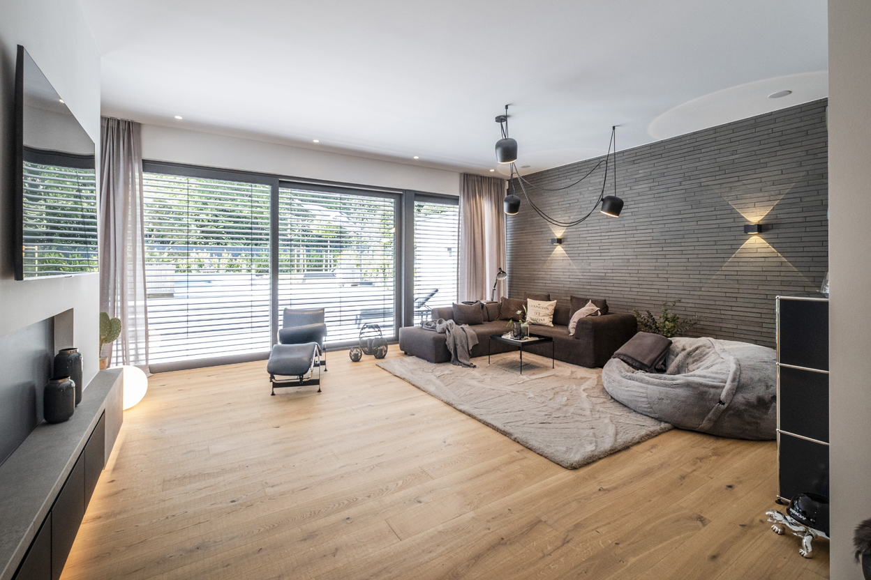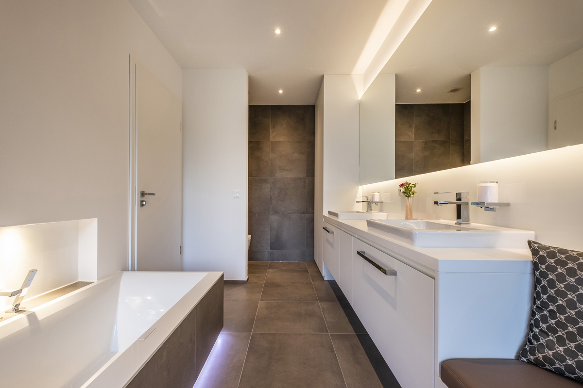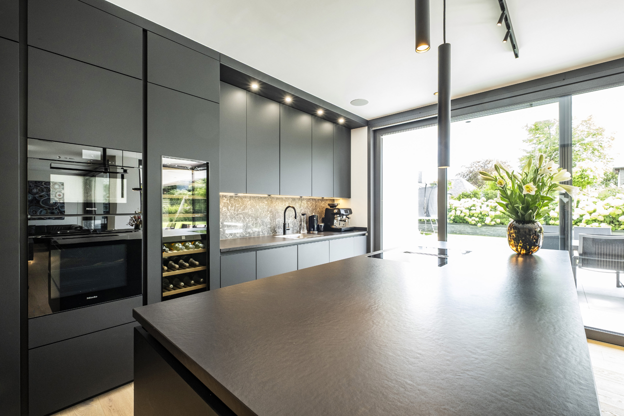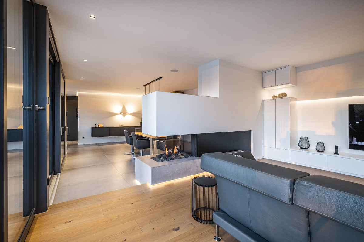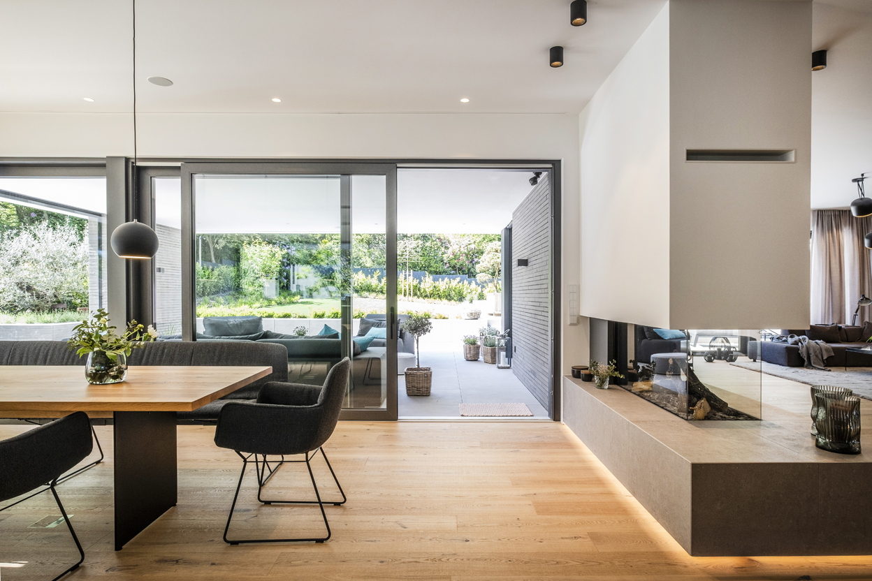 Ein konsequent verfolgtes Farb- und Formkonzept erzeugt hier die schlichte Eleganz, die sich das Bauherren-Ehepaar erwünscht hat. Die Farben Weiß, Schwarz und Anthrazit stehen hier im Vordergrund. Das frische Grün der Pflanzen und der warme Sandton der Kieselsteine geben dem Gesamtprojekt Natürlichkeit und Wärme.