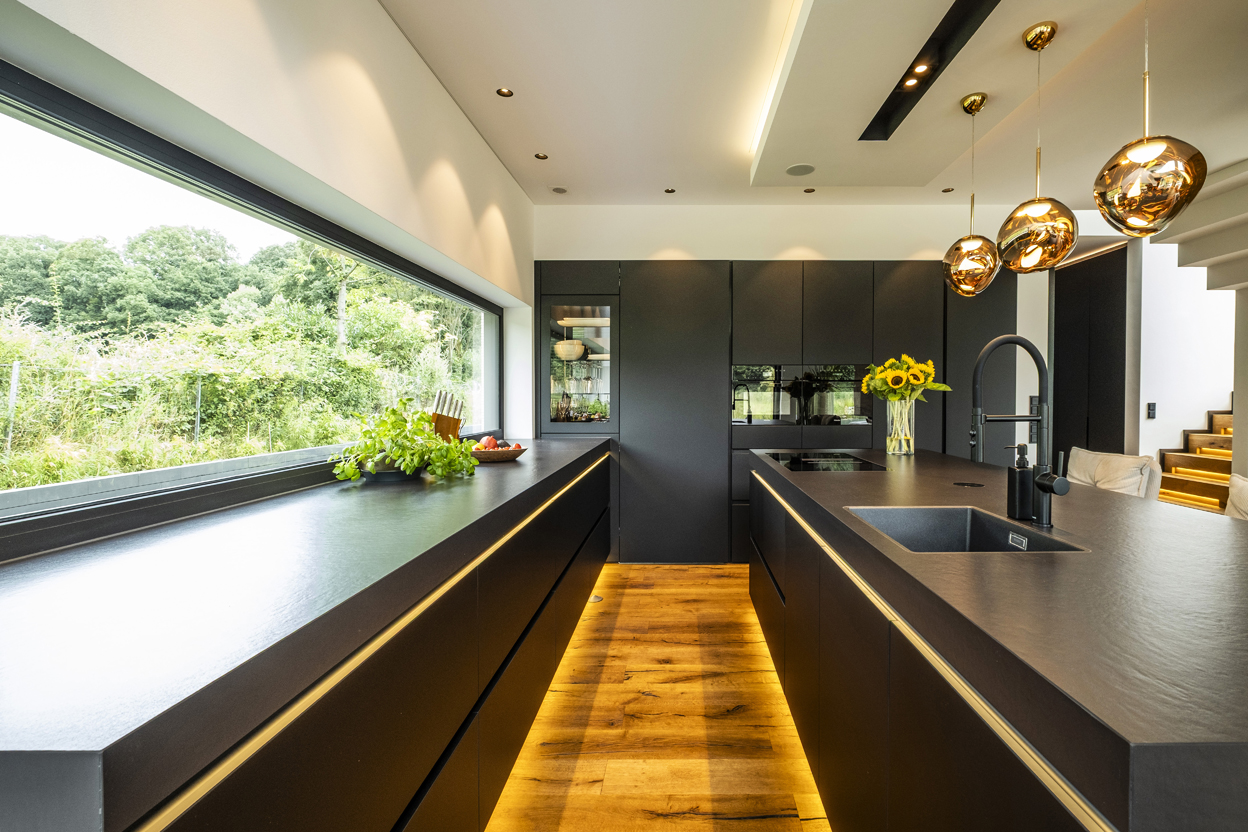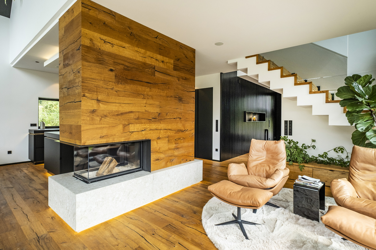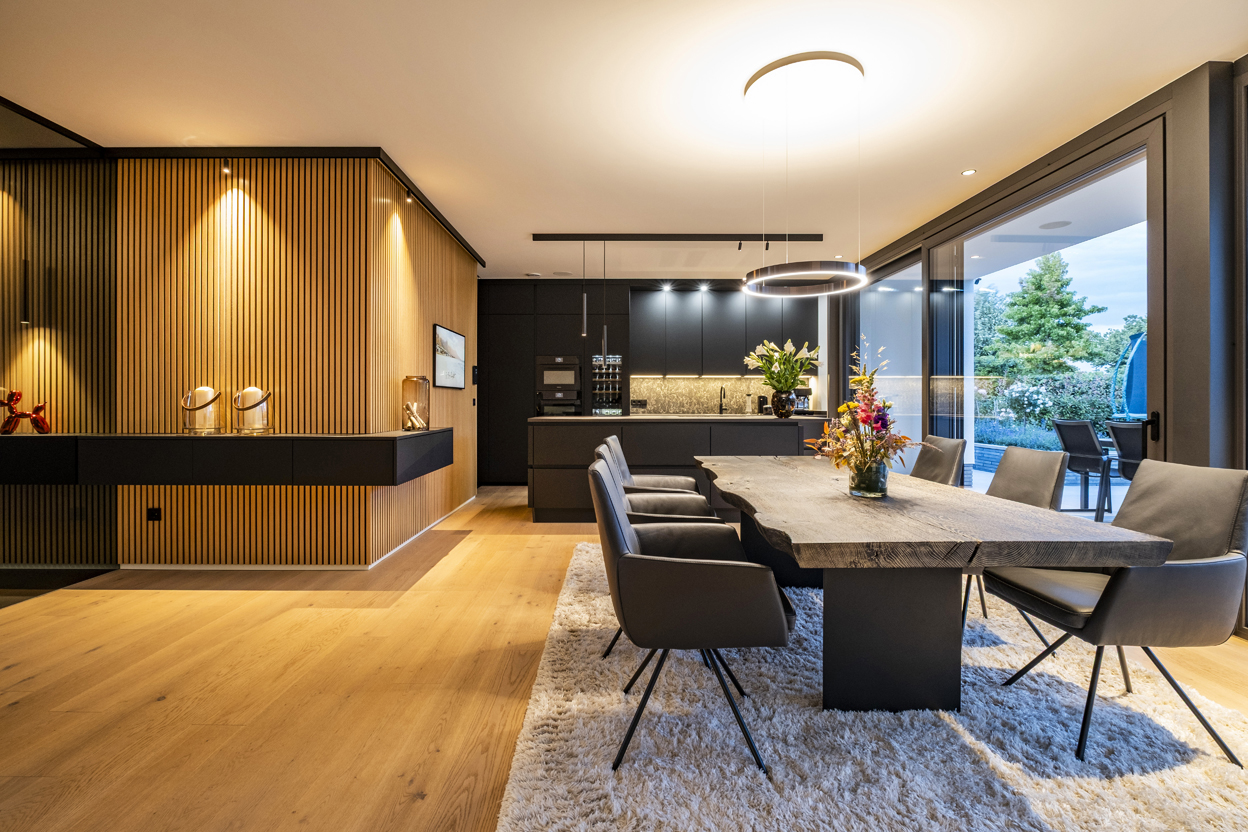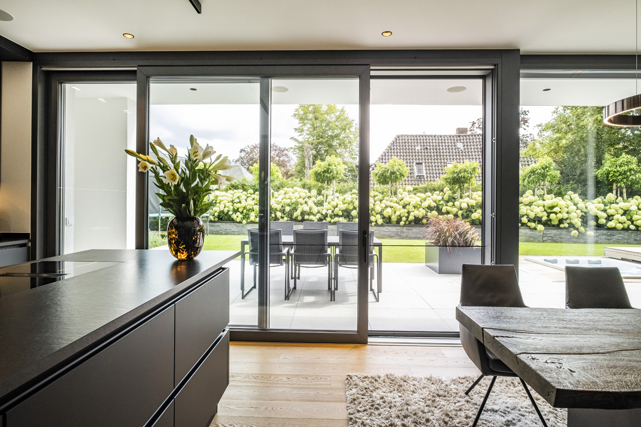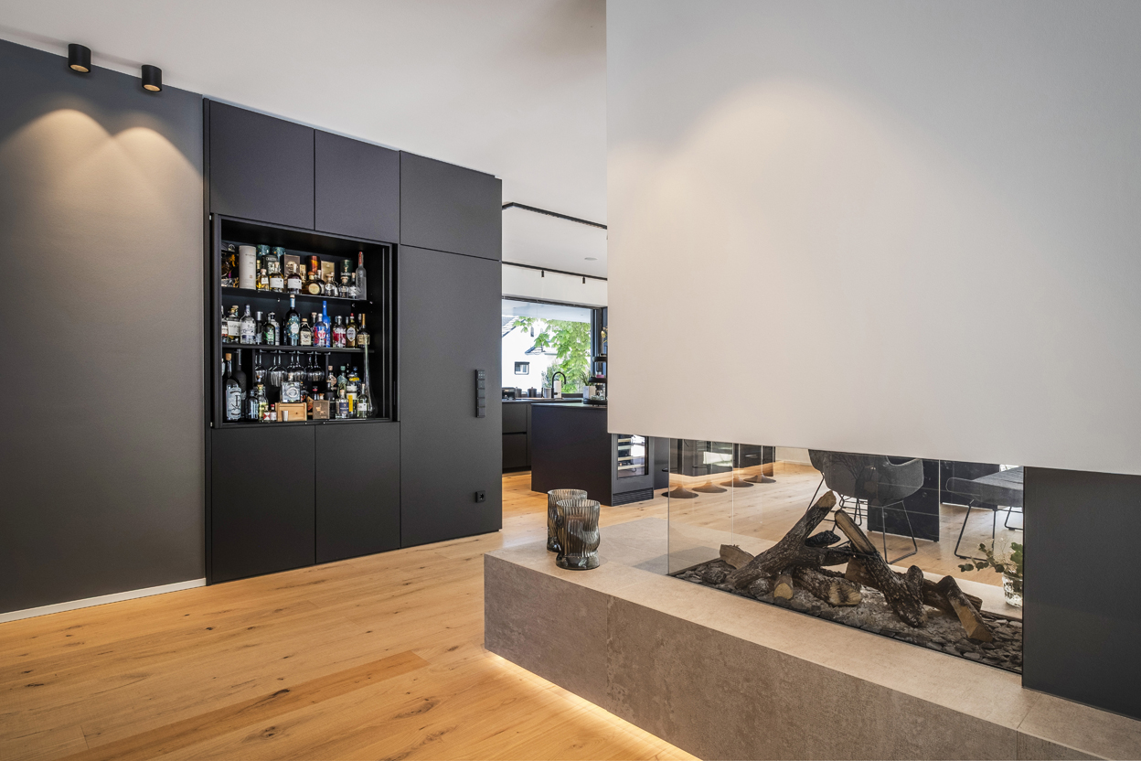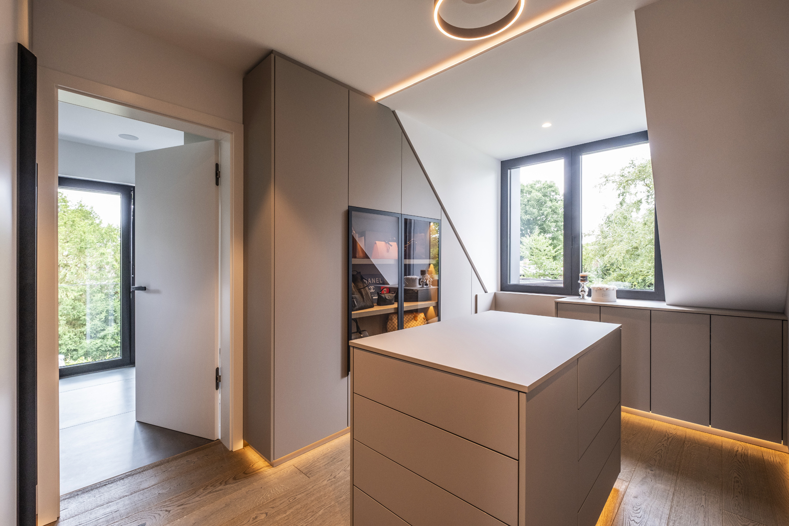 Ein konsequent verfolgtes Farb- und Formkonzept erzeugt hier die schlichte Eleganz, die sich das Bauherren-Ehepaar erwünscht hat. Die Farben Weiß, Schwarz und Anthrazit stehen hier im Vordergrund. Das frische Grün der Pflanzen und der warme Sandton der Kieselsteine geben dem Gesamtprojekt Natürlichkeit und Wärme.