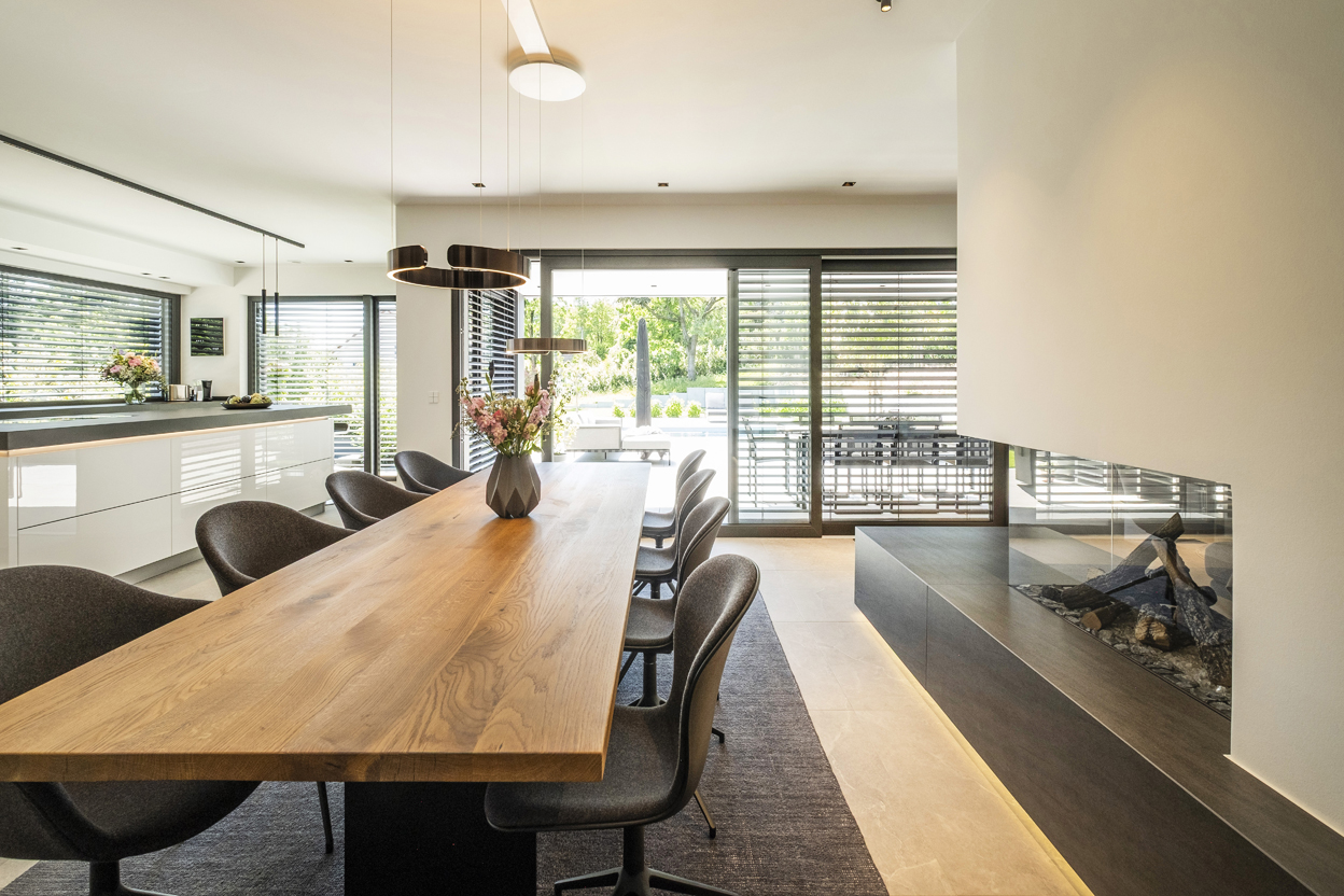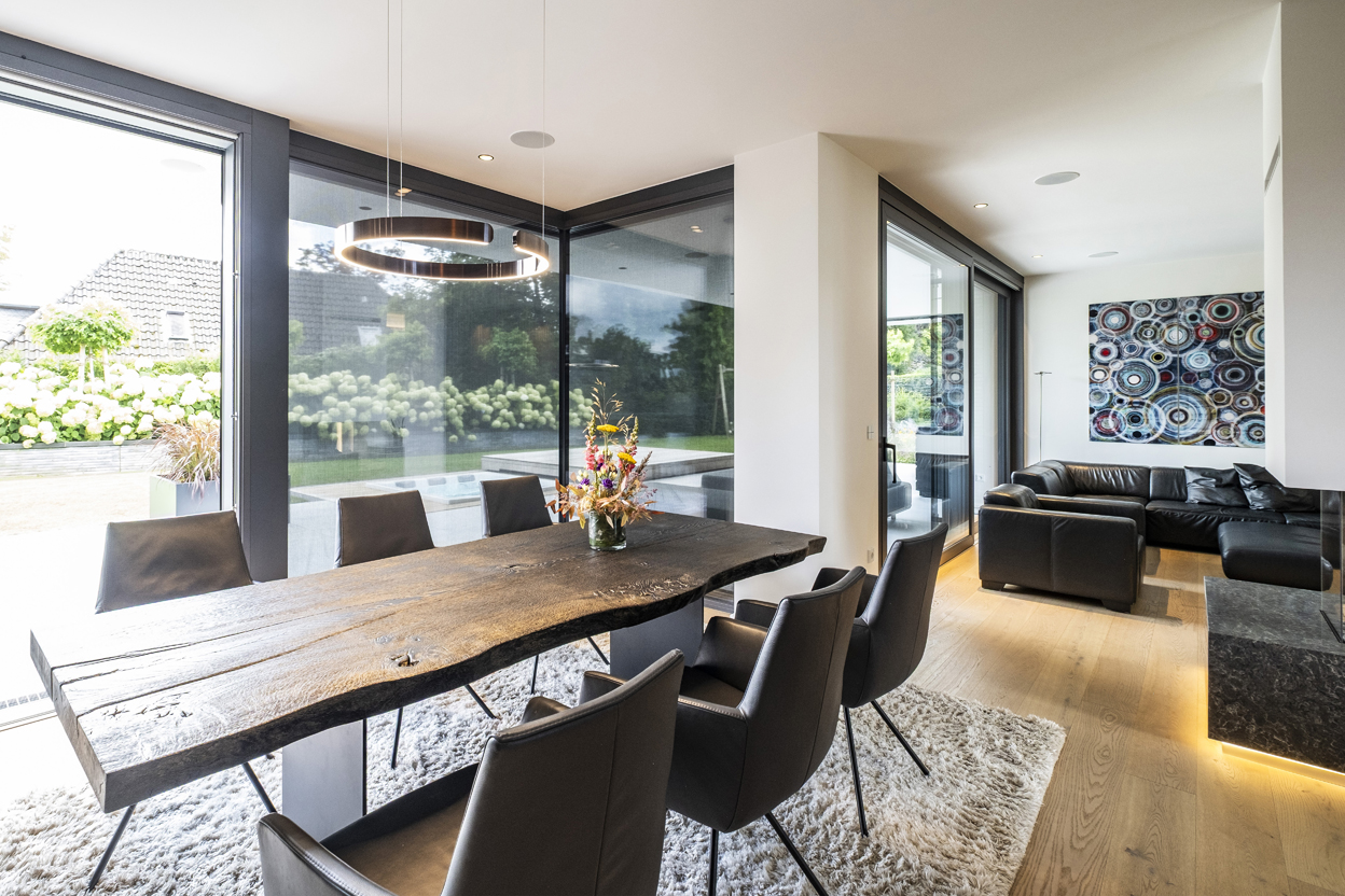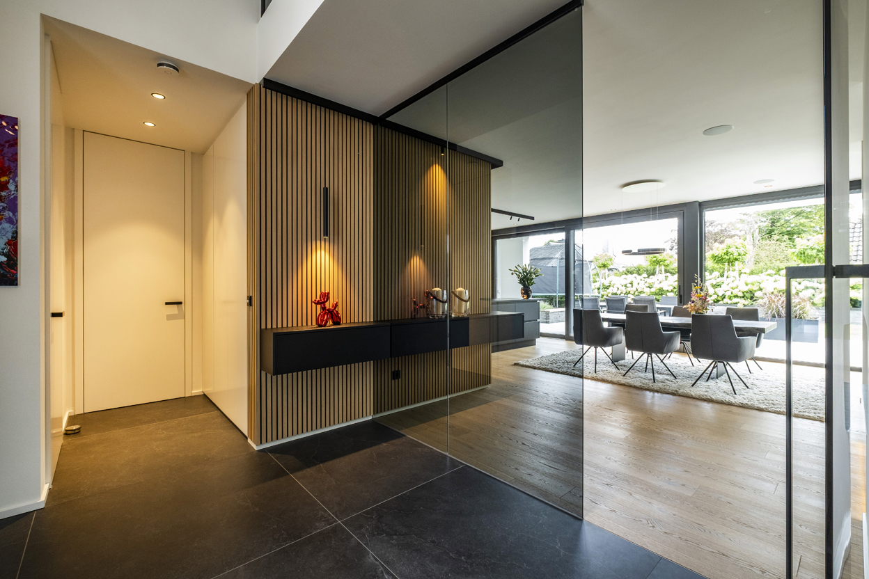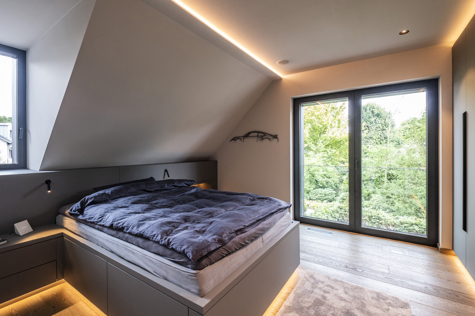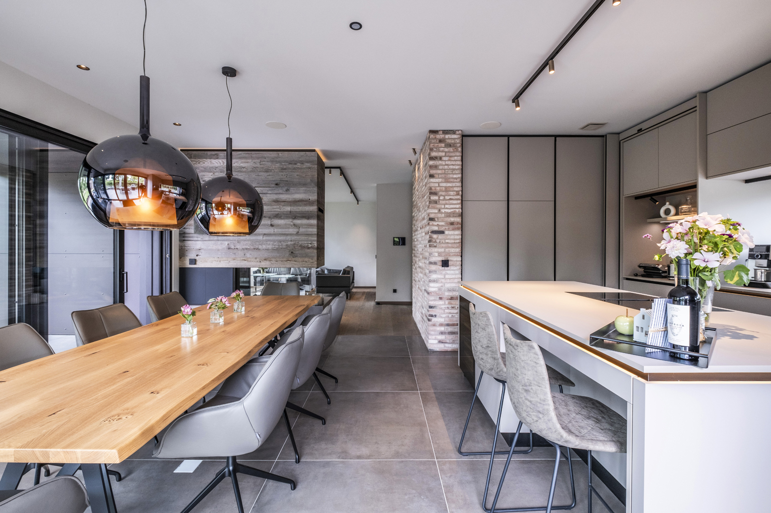 Ein konsequent verfolgtes Farb- und Formkonzept erzeugt hier die schlichte Eleganz, die sich das Bauherren-Ehepaar erwünscht hat. Die Farben Weiß, Schwarz und Anthrazit stehen hier im Vordergrund. Das frische Grün der Pflanzen und der warme Sandton der Kieselsteine geben dem Gesamtprojekt Natürlichkeit und Wärme.