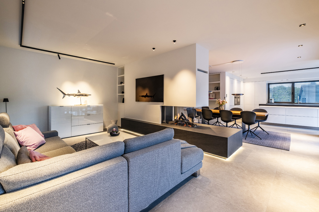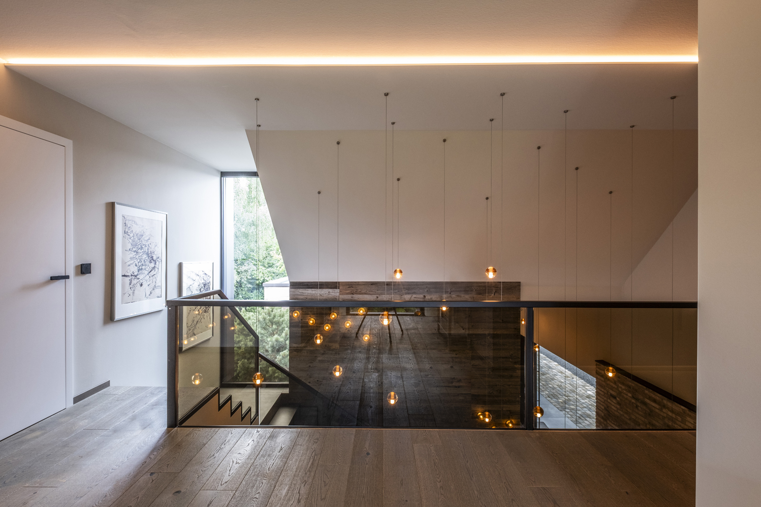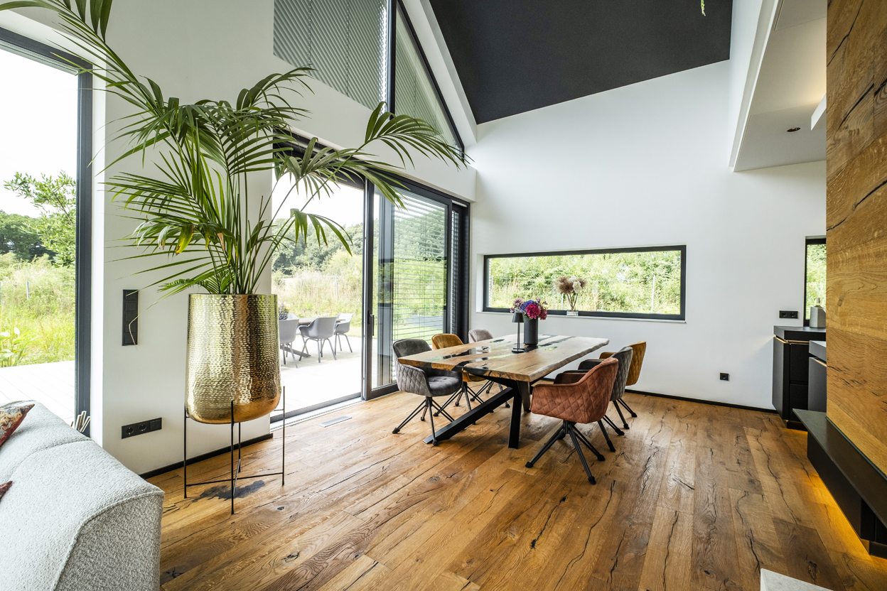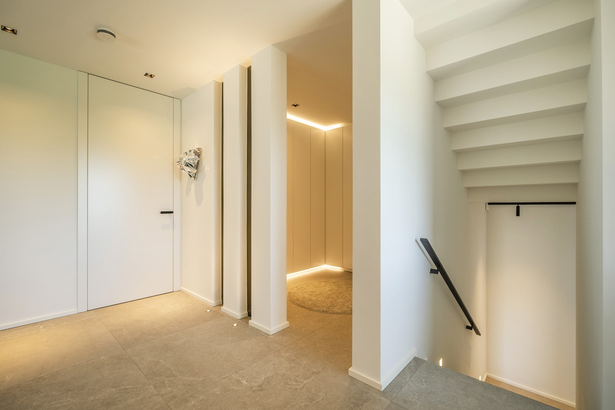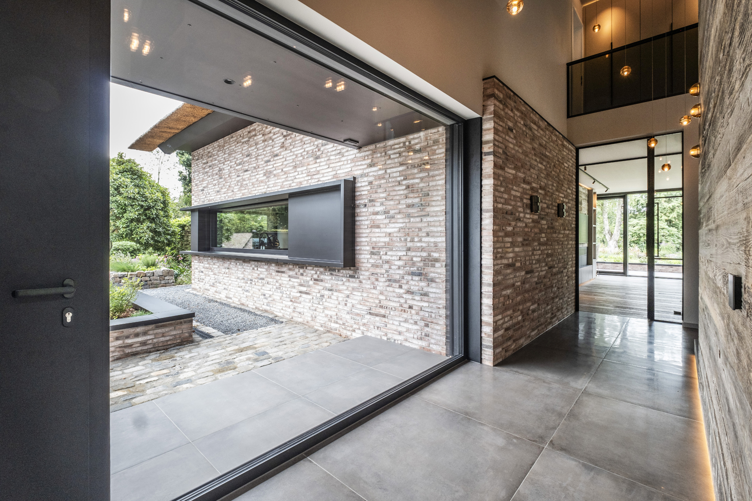 Ein konsequent verfolgtes Farb- und Formkonzept erzeugt hier die schlichte Eleganz, die sich das Bauherren-Ehepaar erwünscht hat. Die Farben Weiß, Schwarz und Anthrazit stehen hier im Vordergrund. Das frische Grün der Pflanzen und der warme Sandton der Kieselsteine geben dem Gesamtprojekt Natürlichkeit und Wärme.
