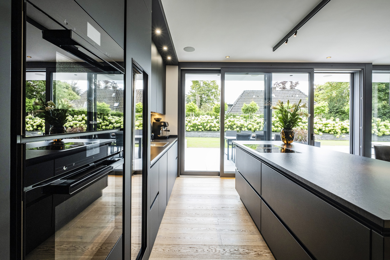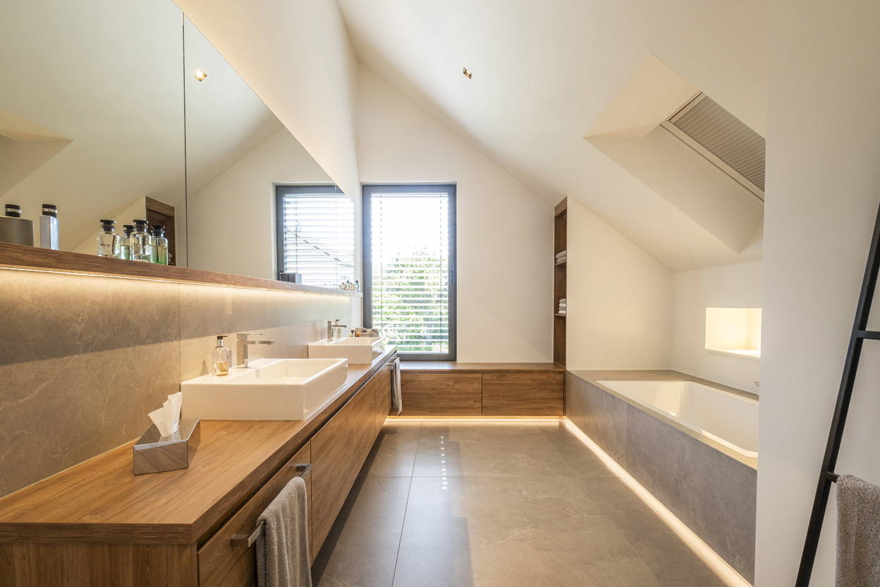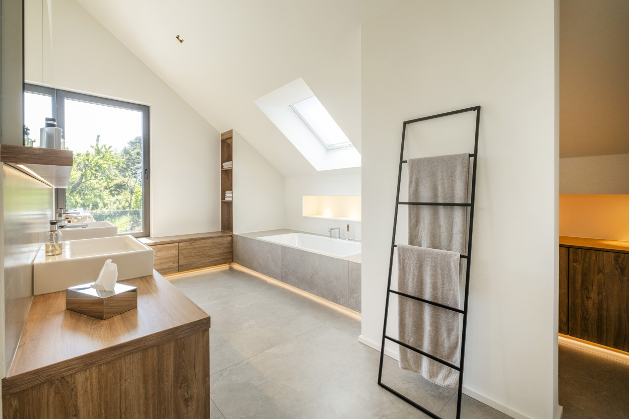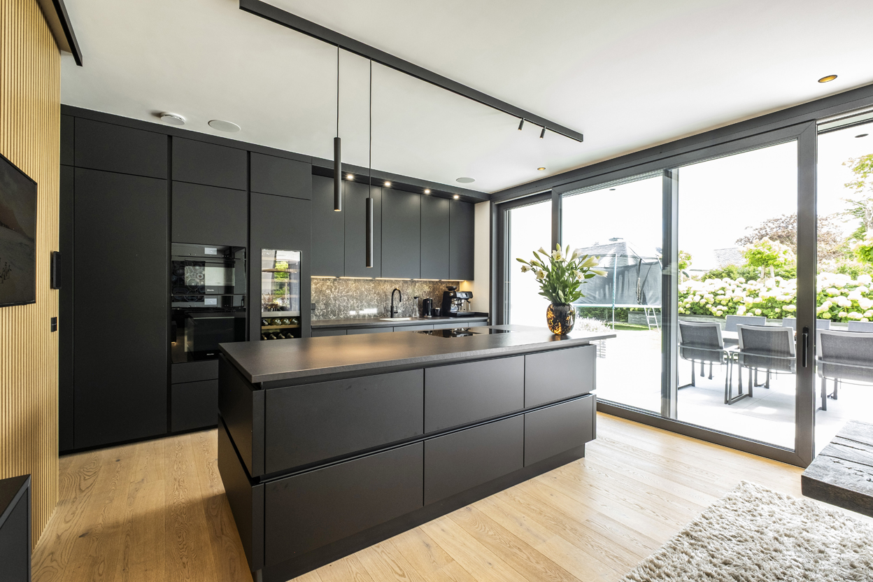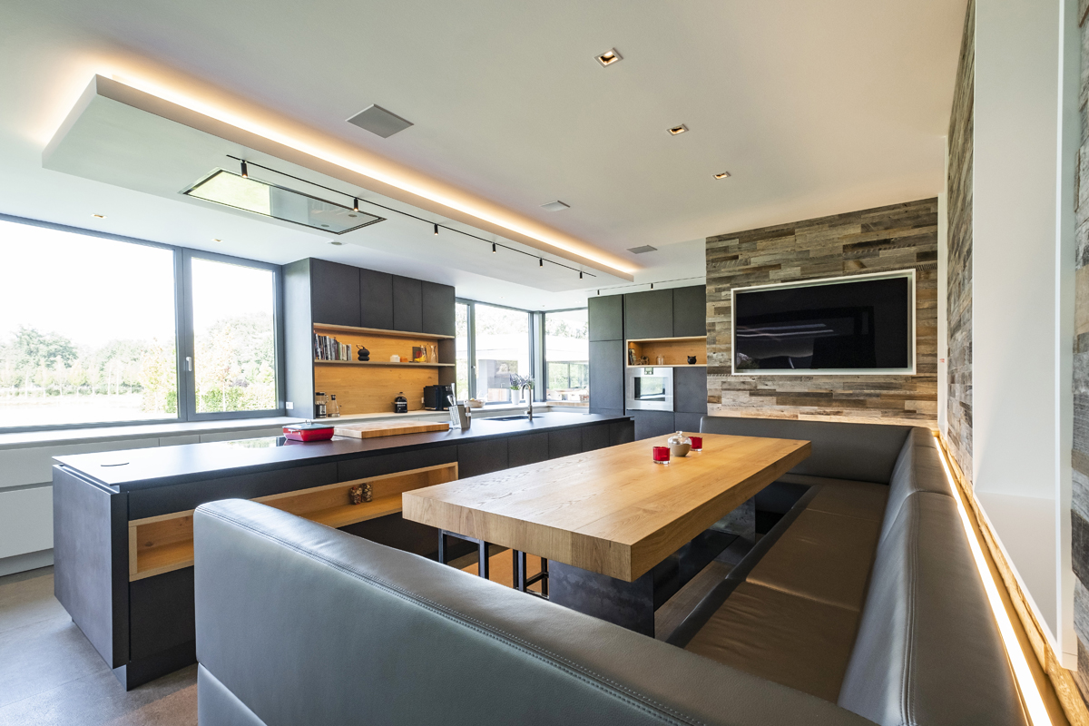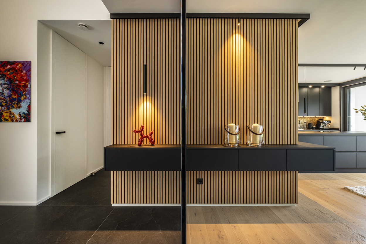 Ein konsequent verfolgtes Farb- und Formkonzept erzeugt hier die schlichte Eleganz, die sich das Bauherren-Ehepaar erwünscht hat. Die Farben Weiß, Schwarz und Anthrazit stehen hier im Vordergrund. Das frische Grün der Pflanzen und der warme Sandton der Kieselsteine geben dem Gesamtprojekt Natürlichkeit und Wärme.
