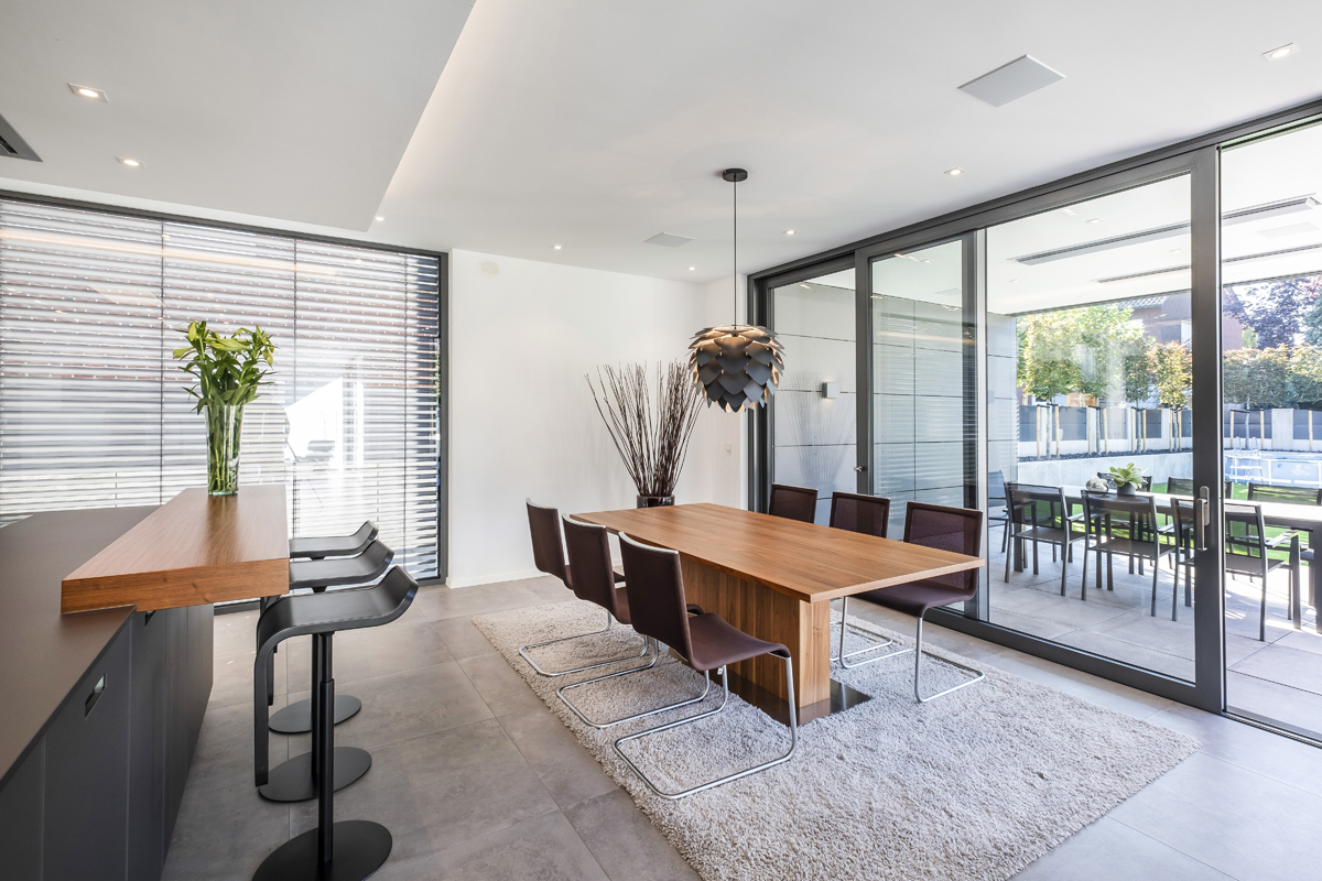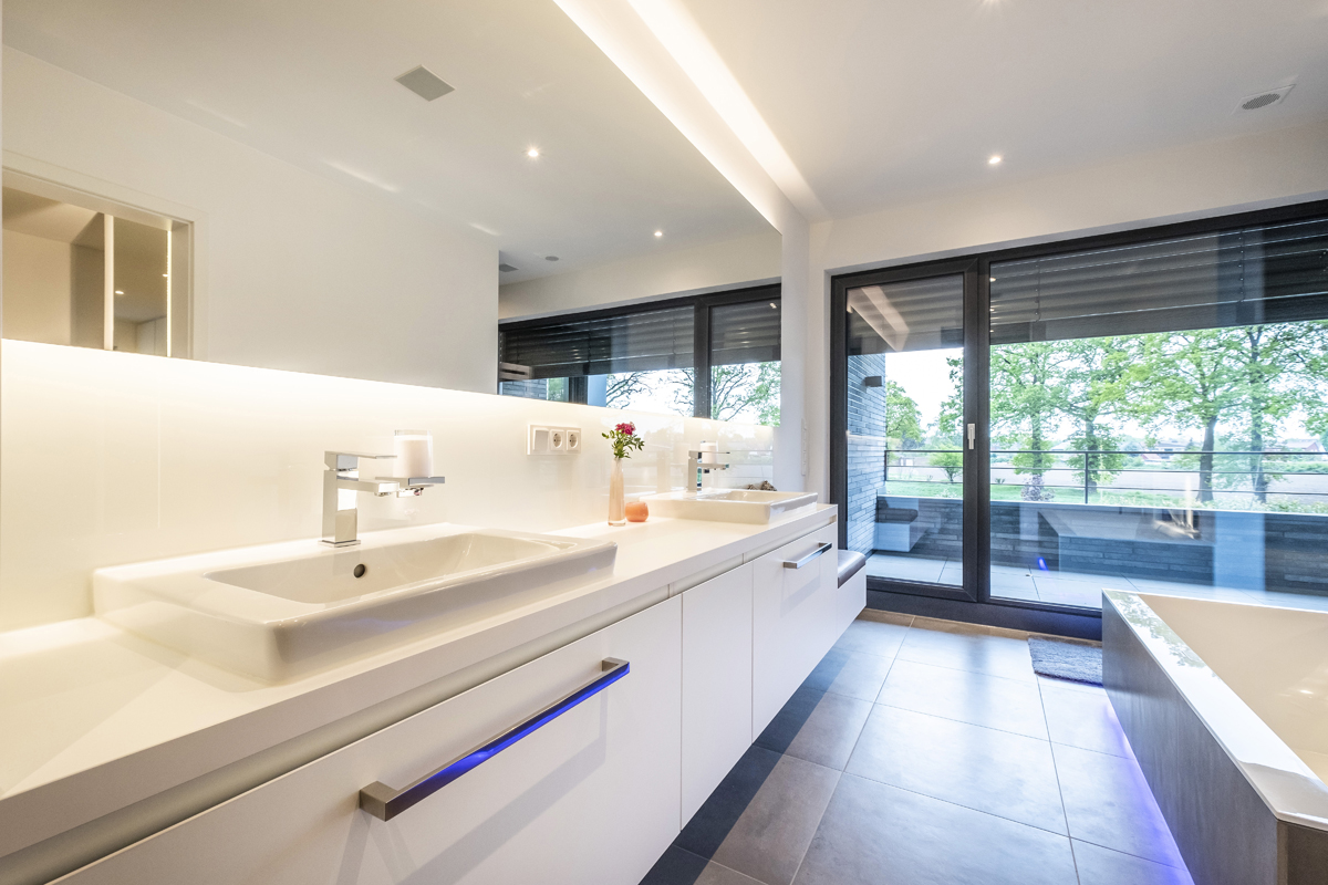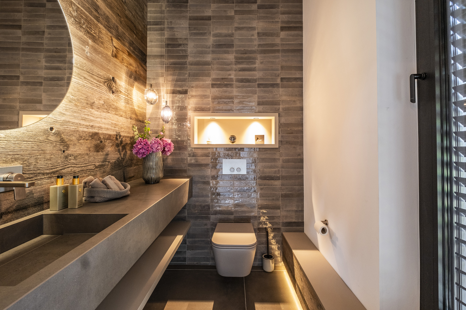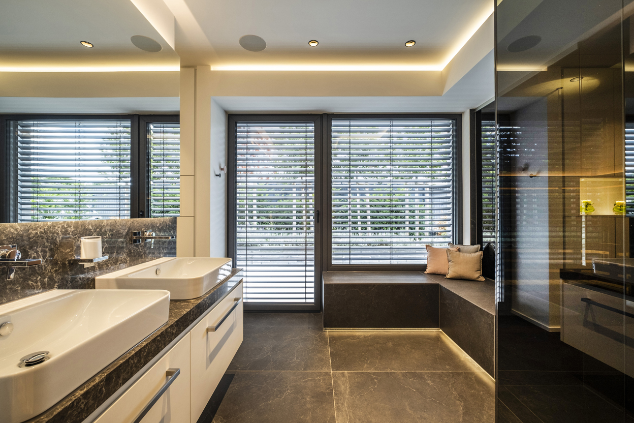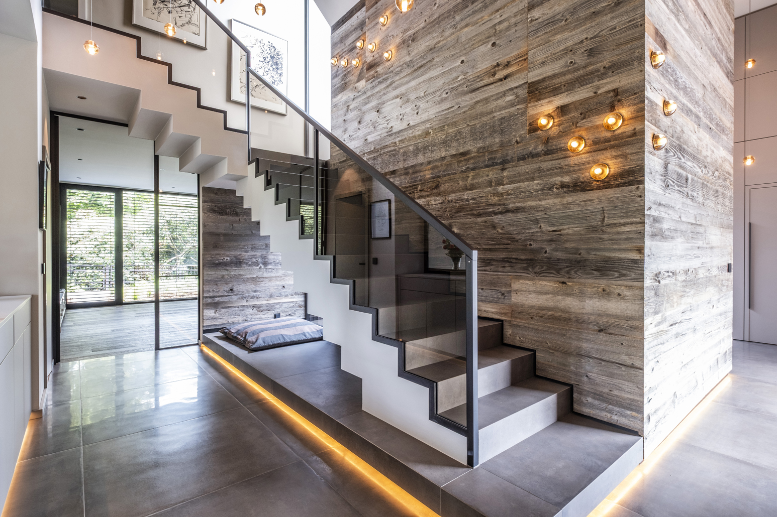 Ein konsequent verfolgtes Farb- und Formkonzept erzeugt hier die schlichte Eleganz, die sich das Bauherren-Ehepaar erwünscht hat. Die Farben Weiß, Schwarz und Anthrazit stehen hier im Vordergrund. Das frische Grün der Pflanzen und der warme Sandton der Kieselsteine geben dem Gesamtprojekt Natürlichkeit und Wärme.
