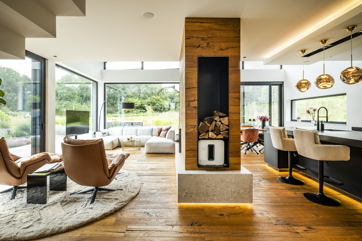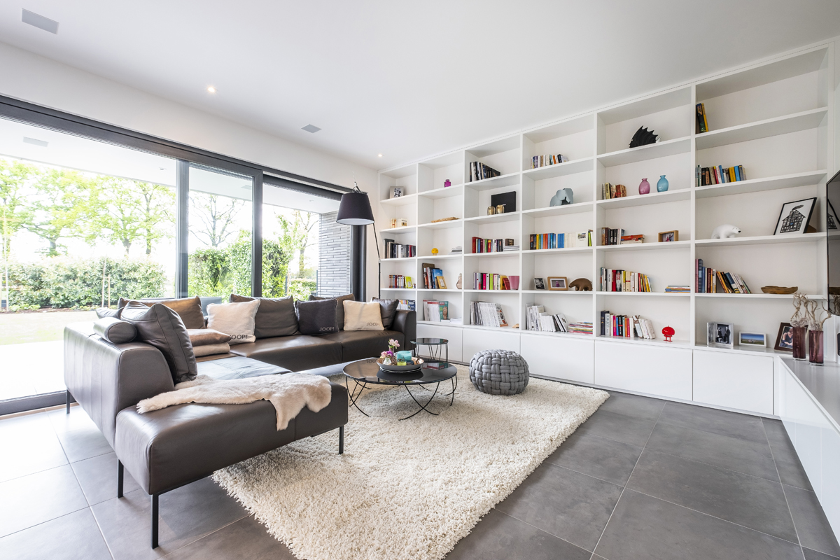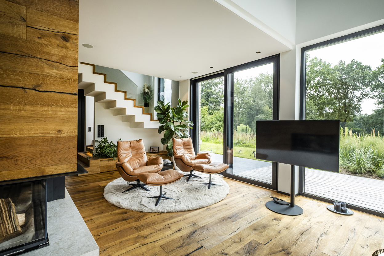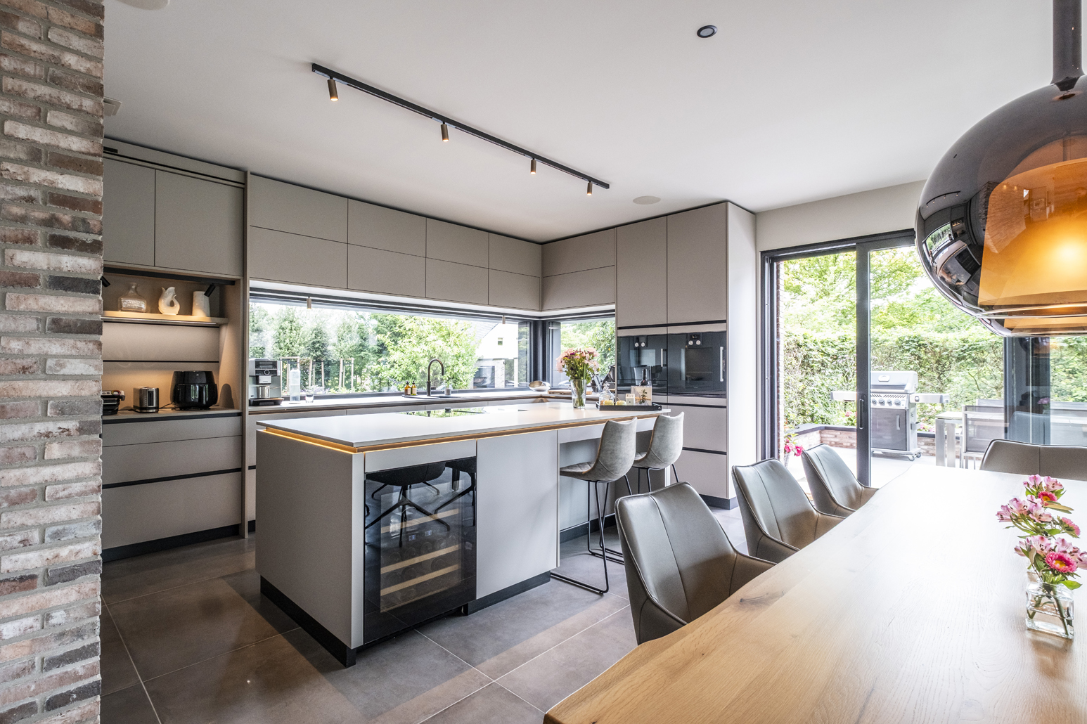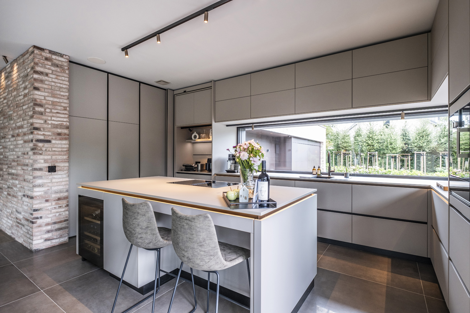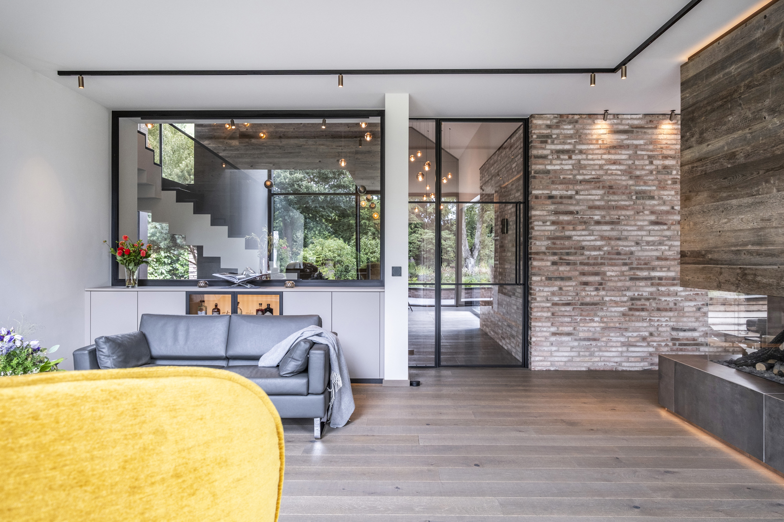 Ein konsequent verfolgtes Farb- und Formkonzept erzeugt hier die schlichte Eleganz, die sich das Bauherren-Ehepaar erwünscht hat. Die Farben Weiß, Schwarz und Anthrazit stehen hier im Vordergrund. Das frische Grün der Pflanzen und der warme Sandton der Kieselsteine geben dem Gesamtprojekt Natürlichkeit und Wärme.