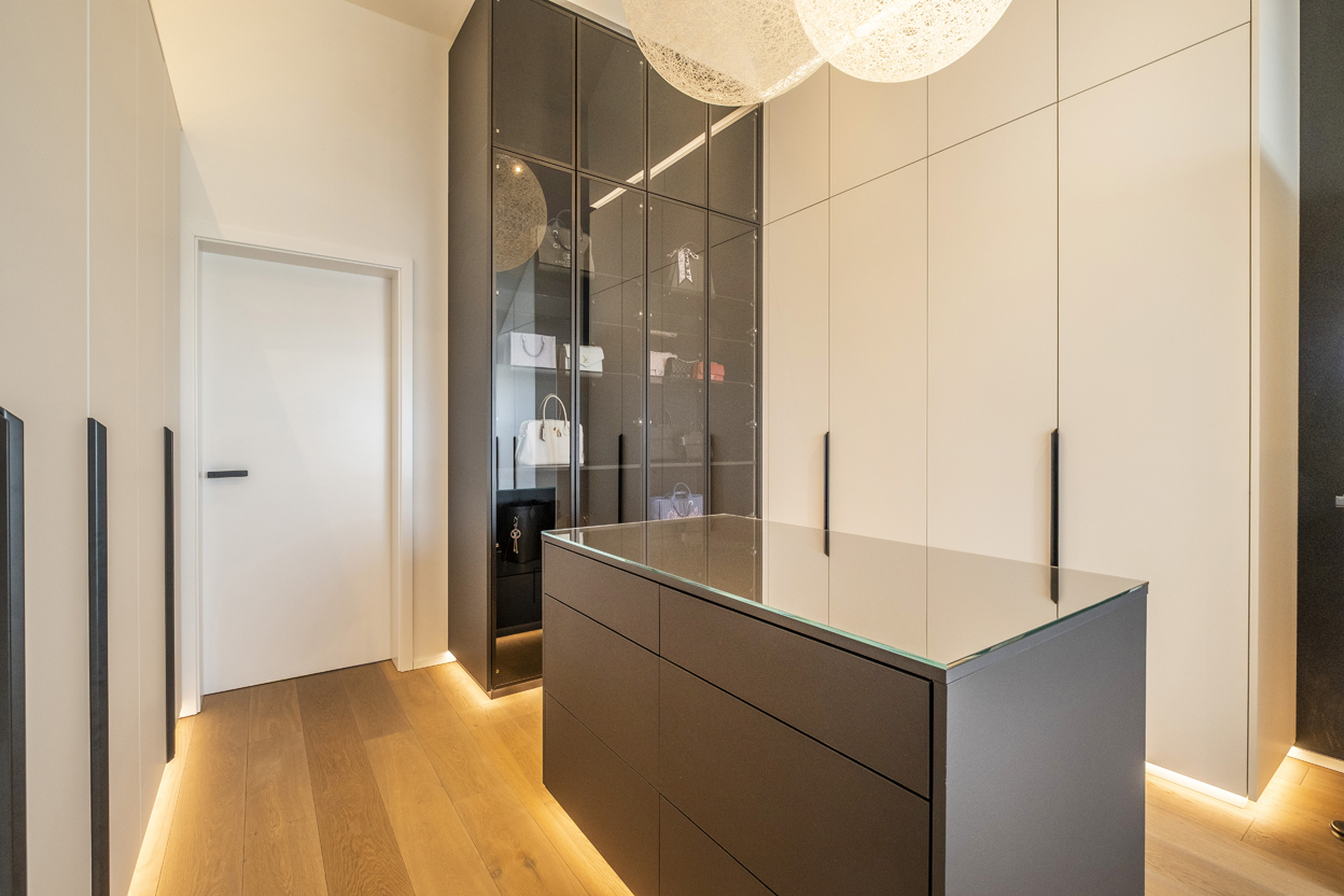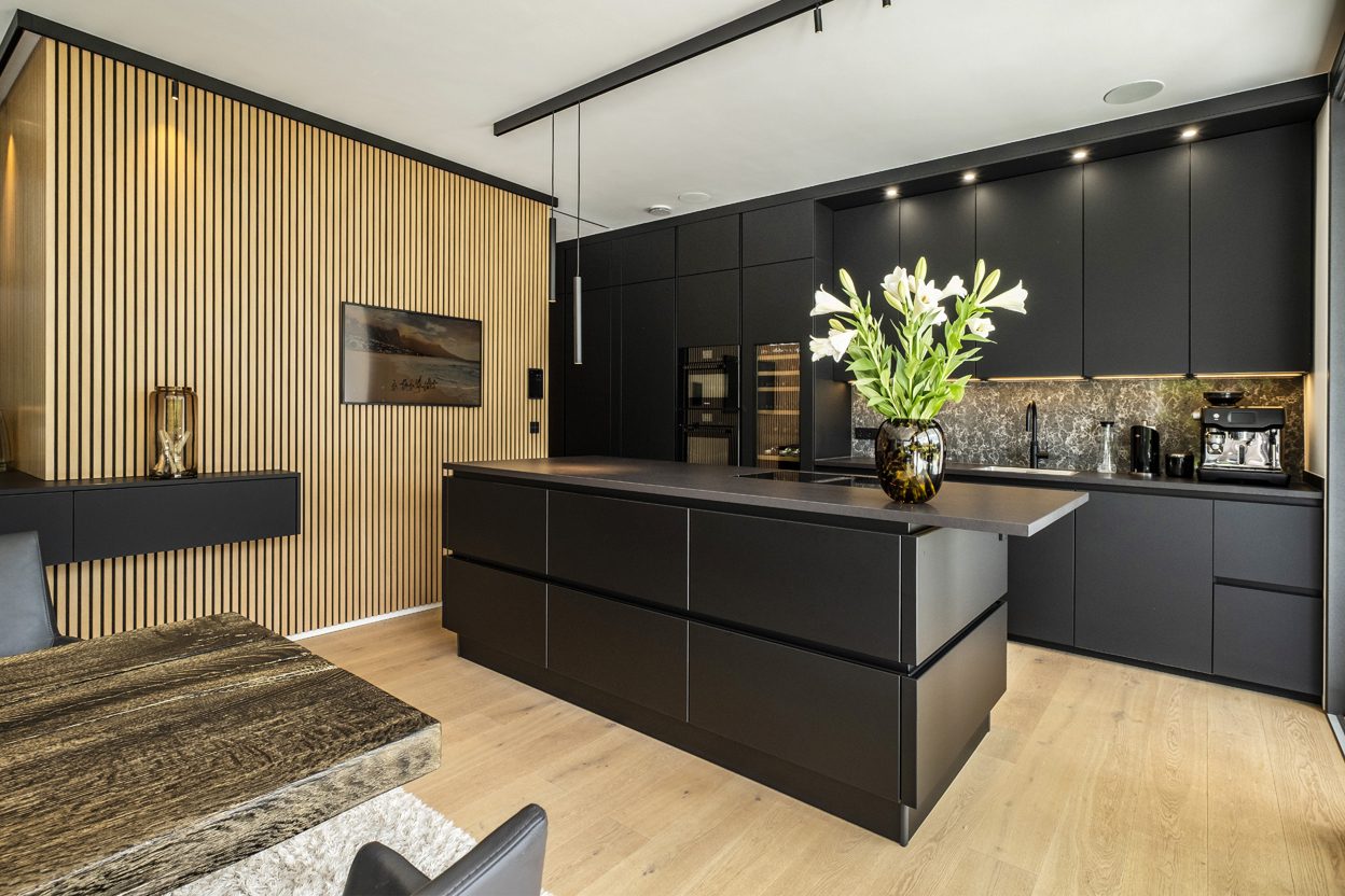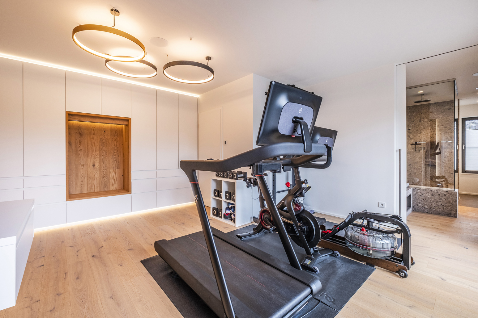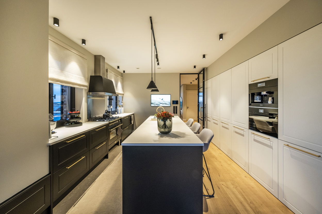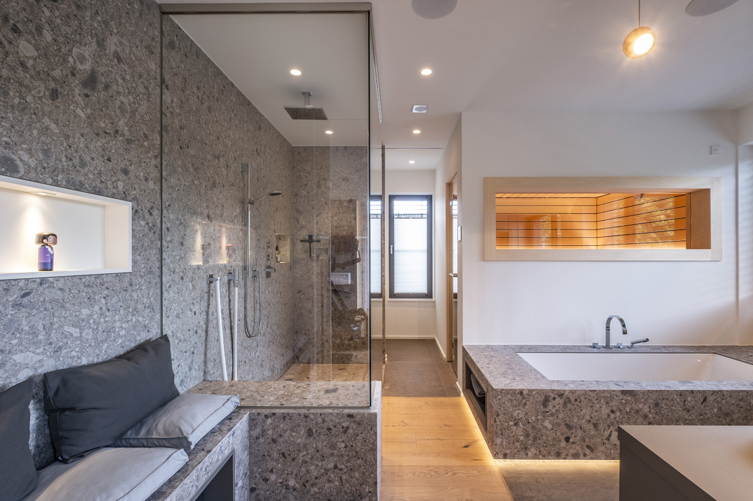Ein konsequent verfolgtes Farb- und Formkonzept erzeugt hier die schlichte Eleganz, die sich das Bauherren-Ehepaar erwünscht hat. Die Farben Weiß, Schwarz und Anthrazit stehen hier im Vordergrund. Das frische Grün der Pflanzen und der warme Sandton der Kieselsteine geben dem Gesamtprojekt Natürlichkeit und Wärme.