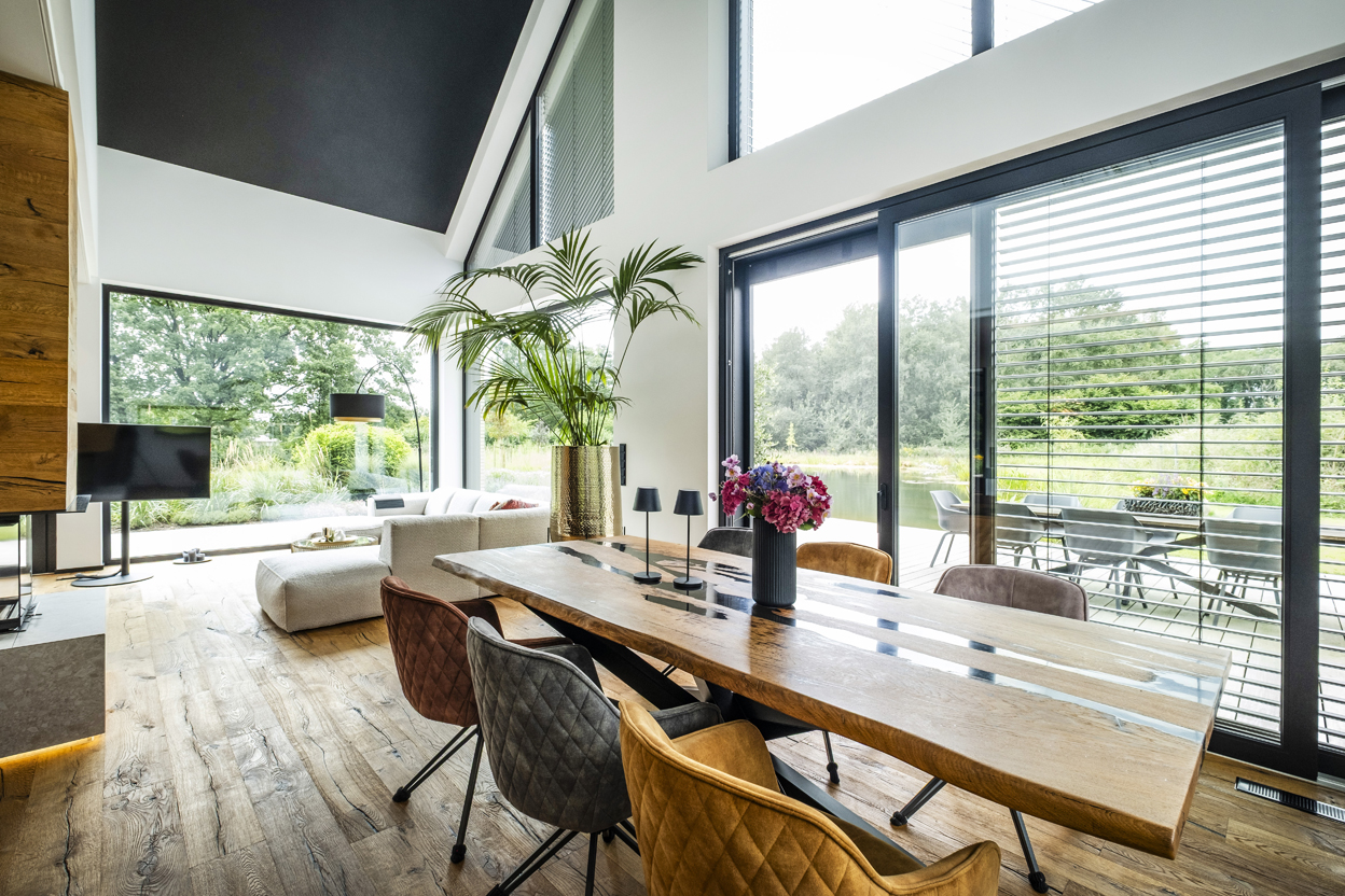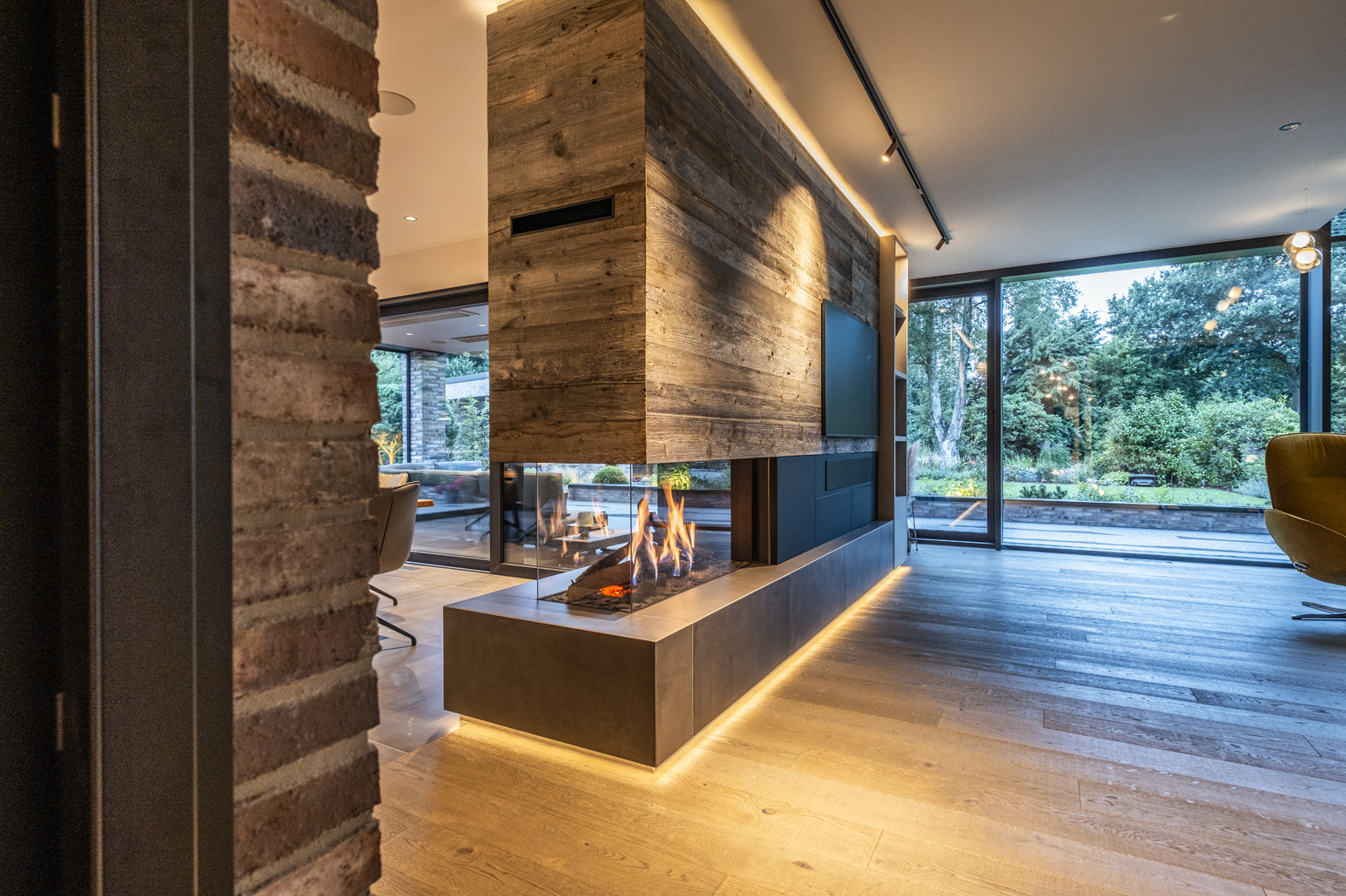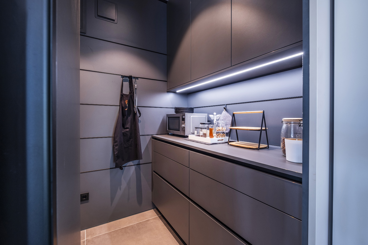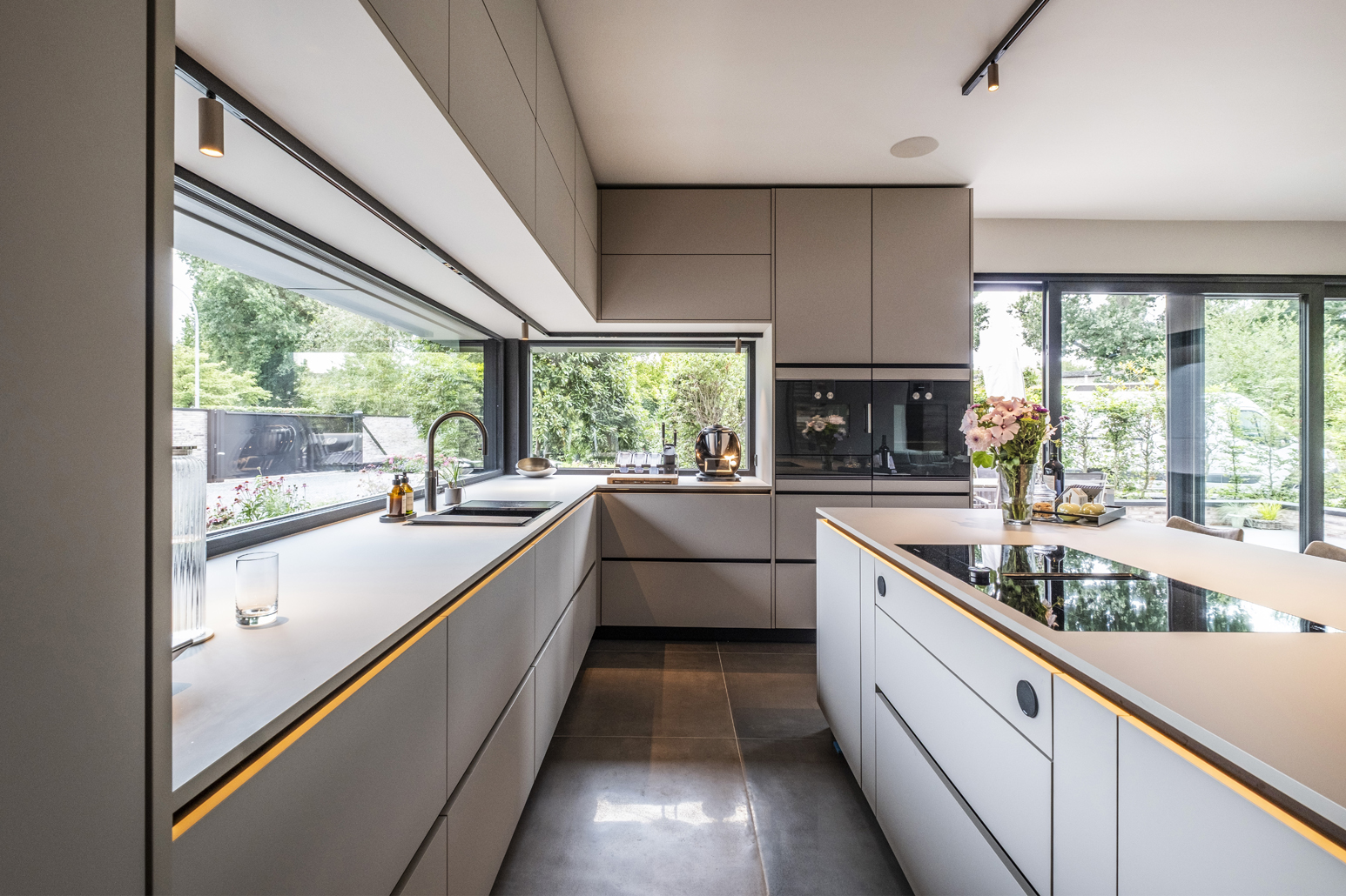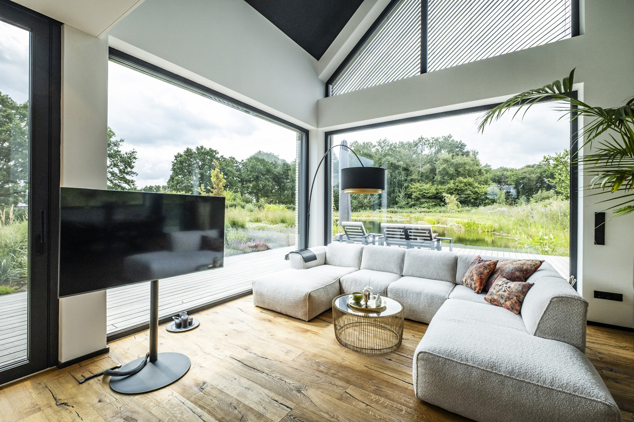 Ein konsequent verfolgtes Farb- und Formkonzept erzeugt hier die schlichte Eleganz, die sich das Bauherren-Ehepaar erwünscht hat. Die Farben Weiß, Schwarz und Anthrazit stehen hier im Vordergrund. Das frische Grün der Pflanzen und der warme Sandton der Kieselsteine geben dem Gesamtprojekt Natürlichkeit und Wärme.
